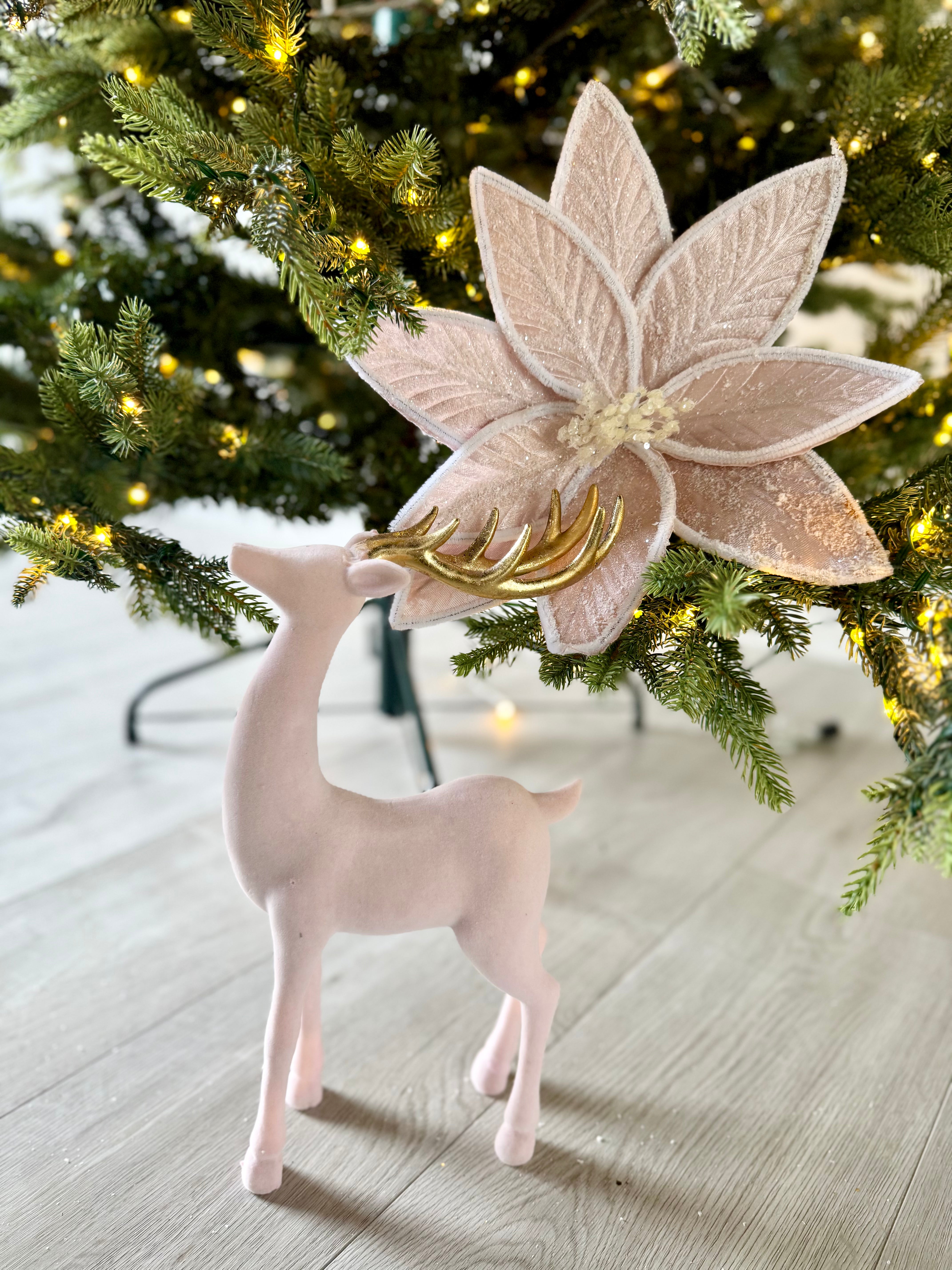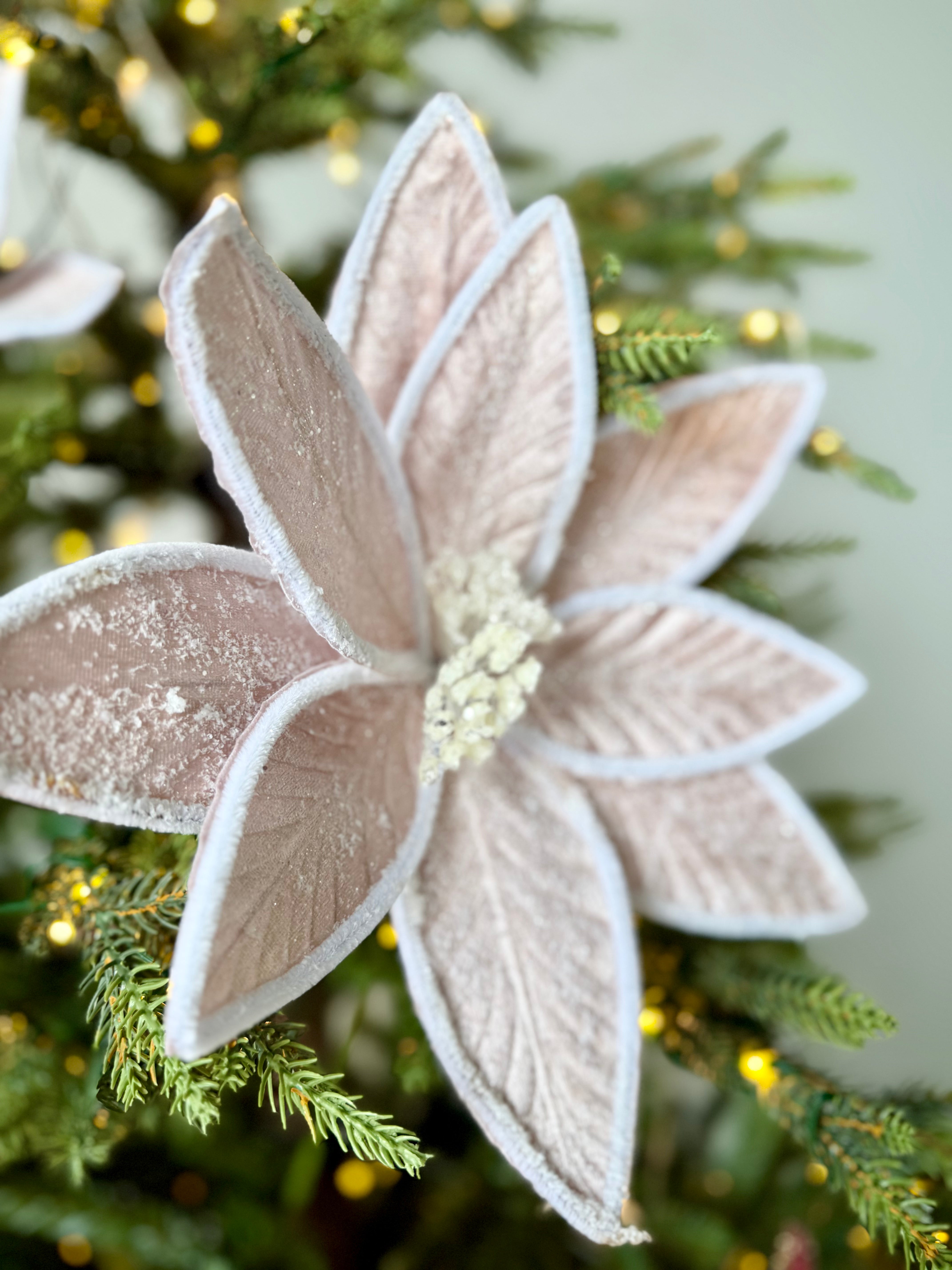 Our light pink poinsettia stem offers timeless beauty. Crafted from luxurious material this exquisite piece will add a touch of elegance to your Christmas decor with its rich texture and shimmering touches. Each petal evokes sophistication. Discover this exquisite piece now and transform your space into a haven of winter greenery.