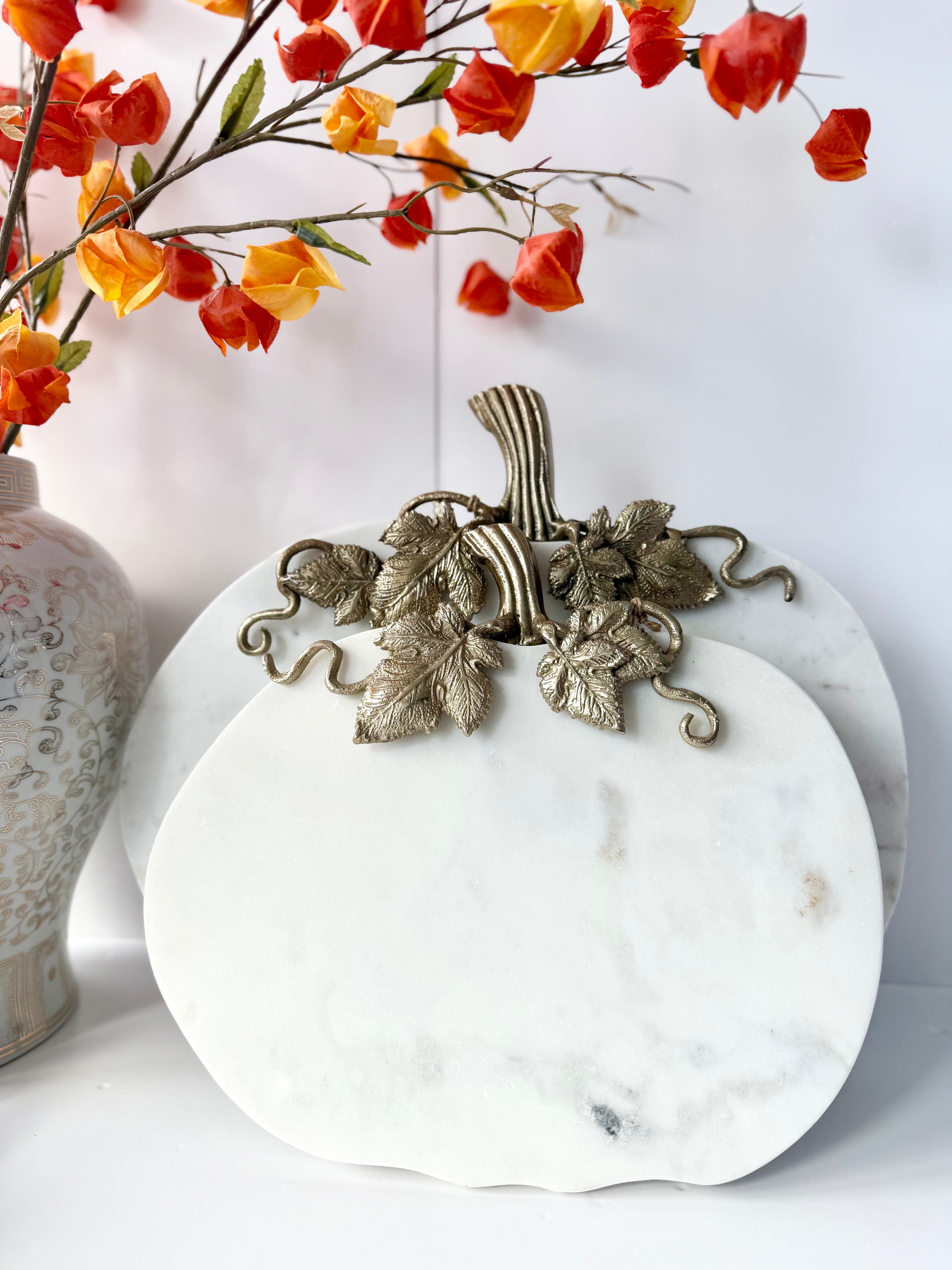 Entertain your guests with this natural marble serving tray featuring gold metal leaf accents, pumpkin. It is a multipurpose server can be used to decorate the kitchen or in a party to serve your desserts. *Marble is a product of nature and no two pieces are exactly alike, it is prone to variations in color and/or patterns in the material that adds to the beauty and charm of the piece.