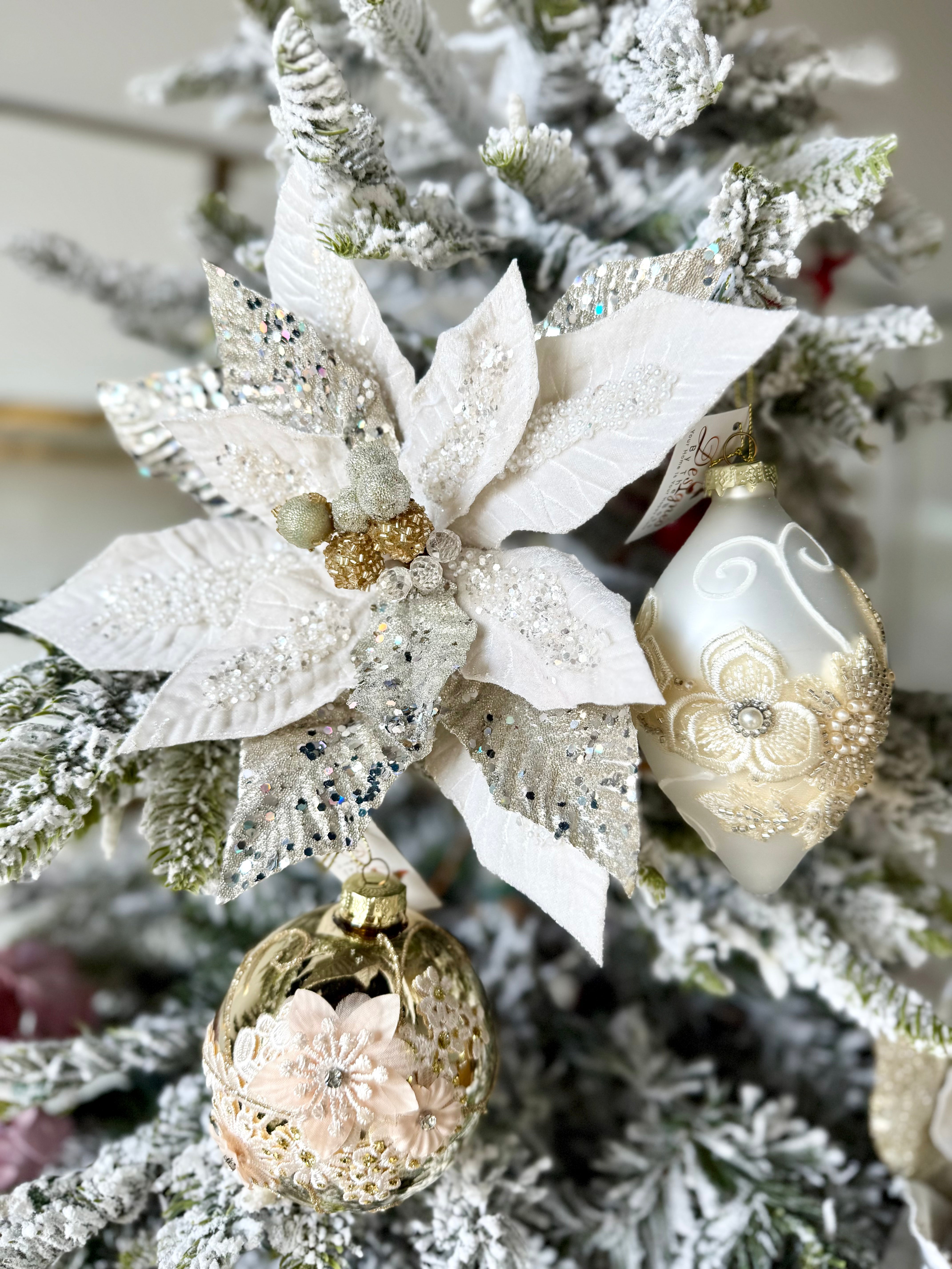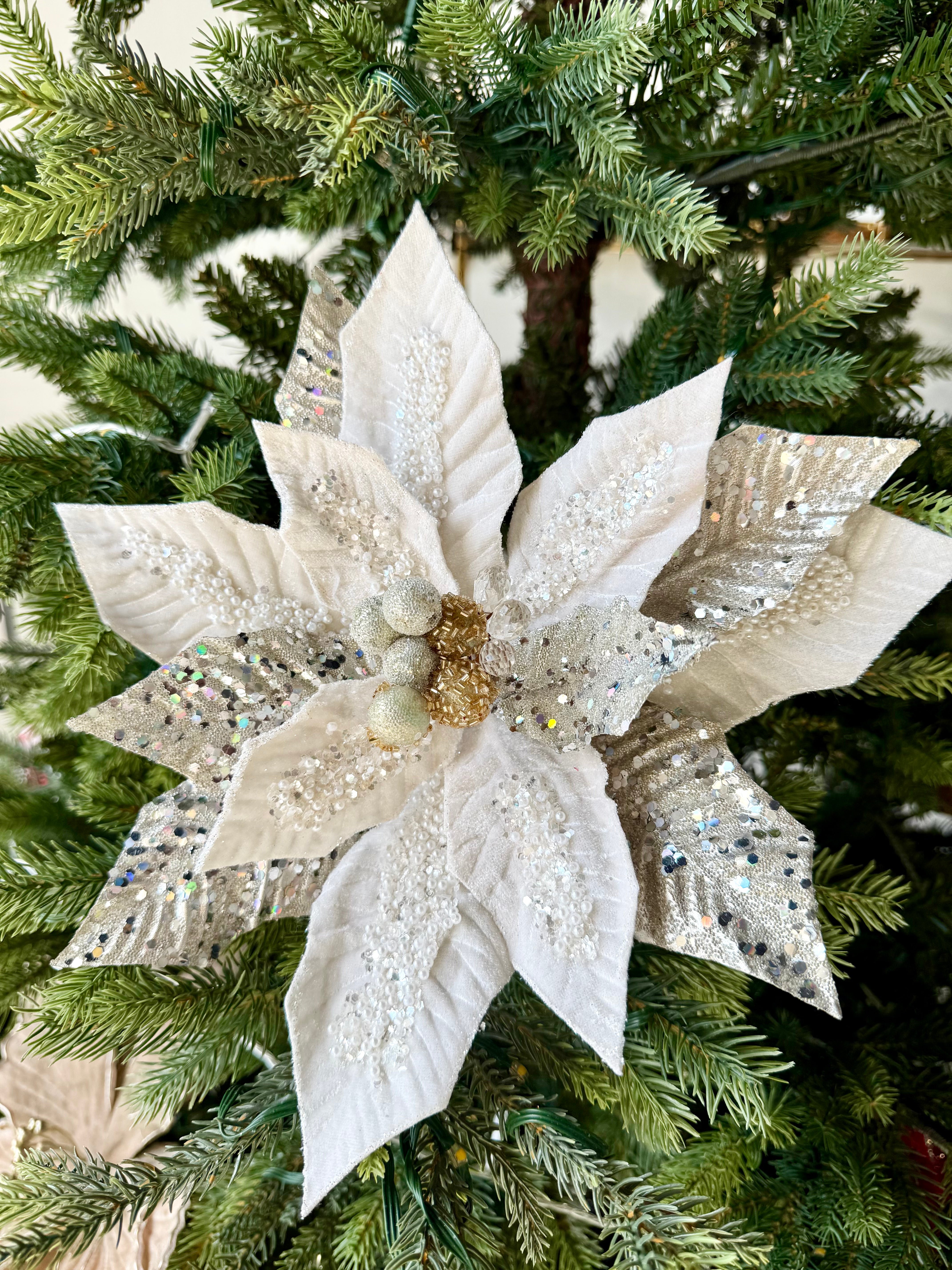 Add a touch of elegance to your Christmas decor with our cream poinsettia stem. Its cream petals and gold accents make our poinsettia stem a stunning addition for the holidays. Perfect for wreaths, centerpieces, or mantel decorations, these flowers bring festive charm to every corner. Each petal evokes sophistication. Find this exquisite piece now and transform your space into a winter wonderland. ❄️✨ Beautify your space today.