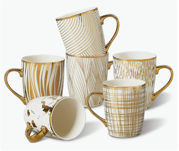 Enjoy your favorite beverage in style. These beautiful gold-plated ceramic coffee mugs, adorned with various details, will add an artistic touch to your table. Their 18 oz capacity makes them the ideal choice for those who prefer a larger quantity of their favorite beverage. Available in a wide range of styles, they allow you to customize them to suit all tastes and the aesthetic of your kitchen. Do not microwave or dishwasher. Hand wash only.