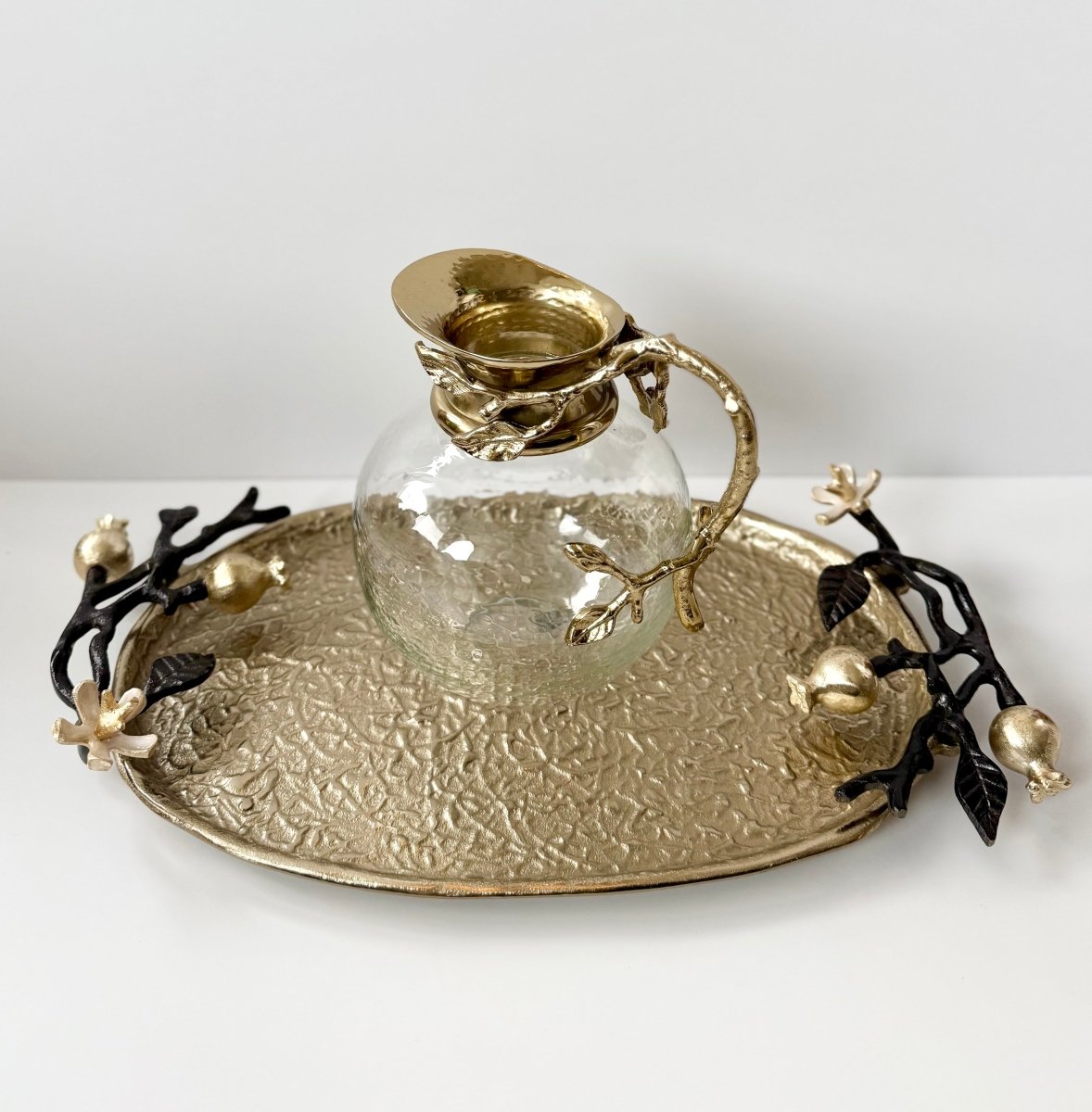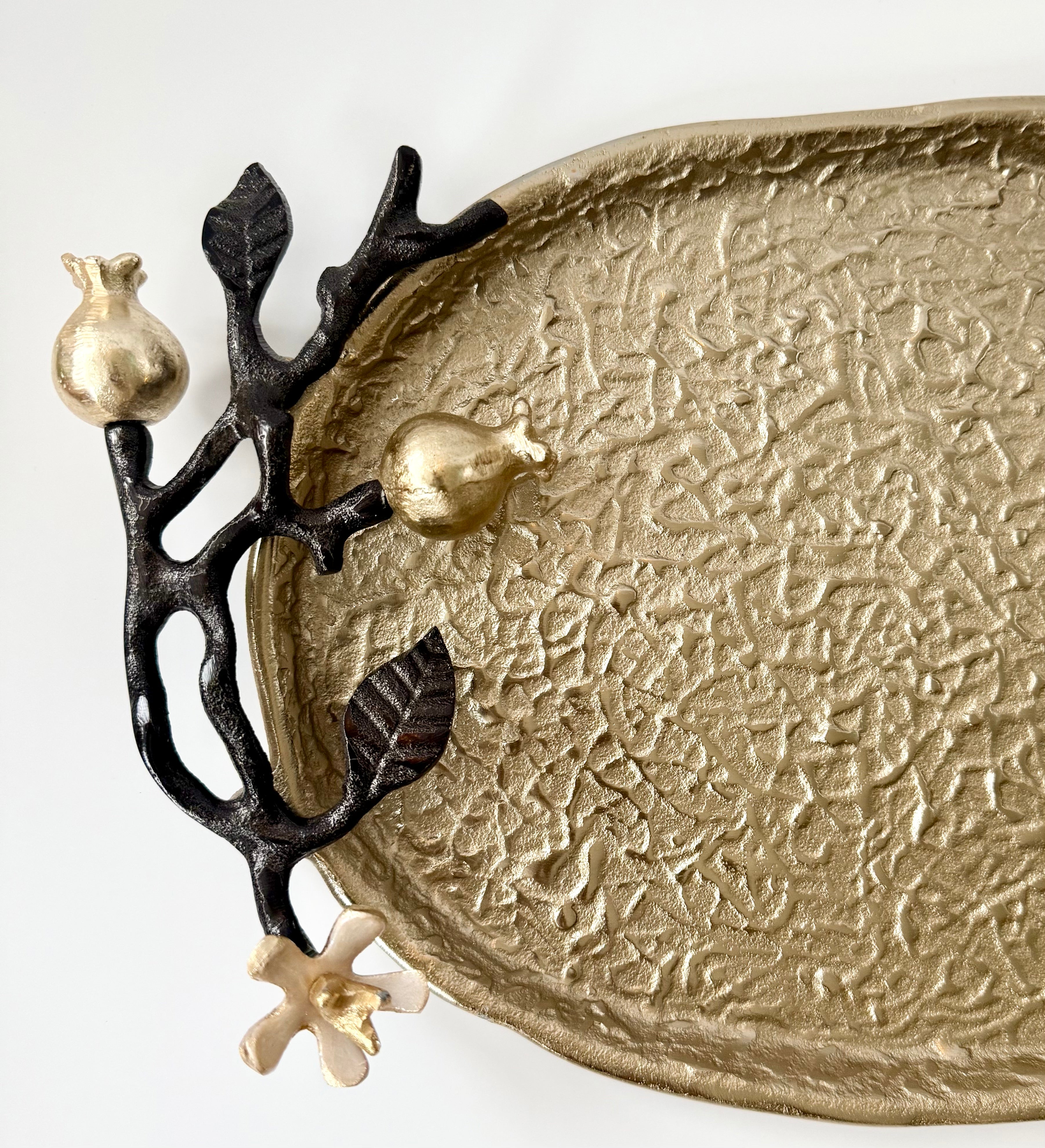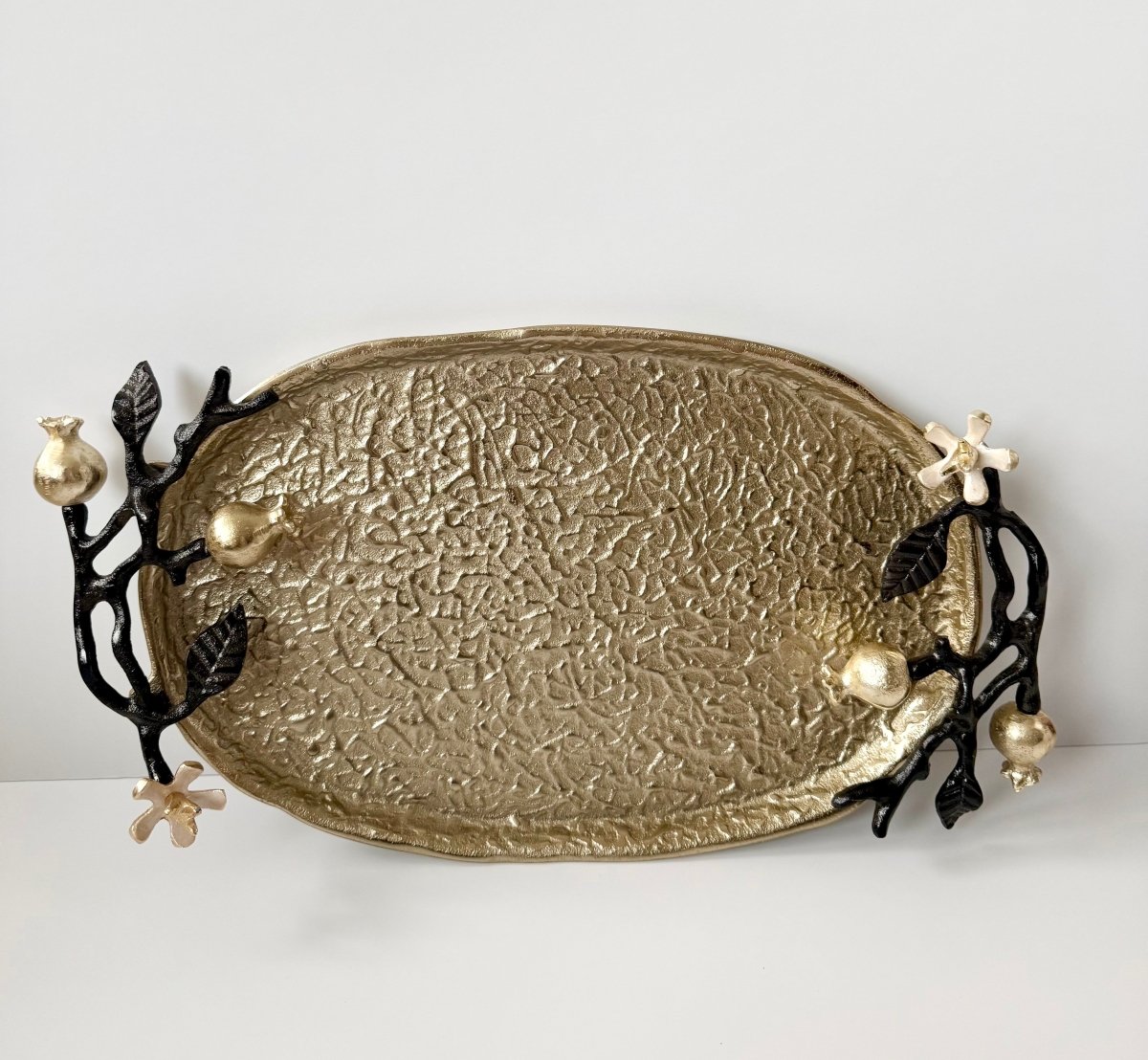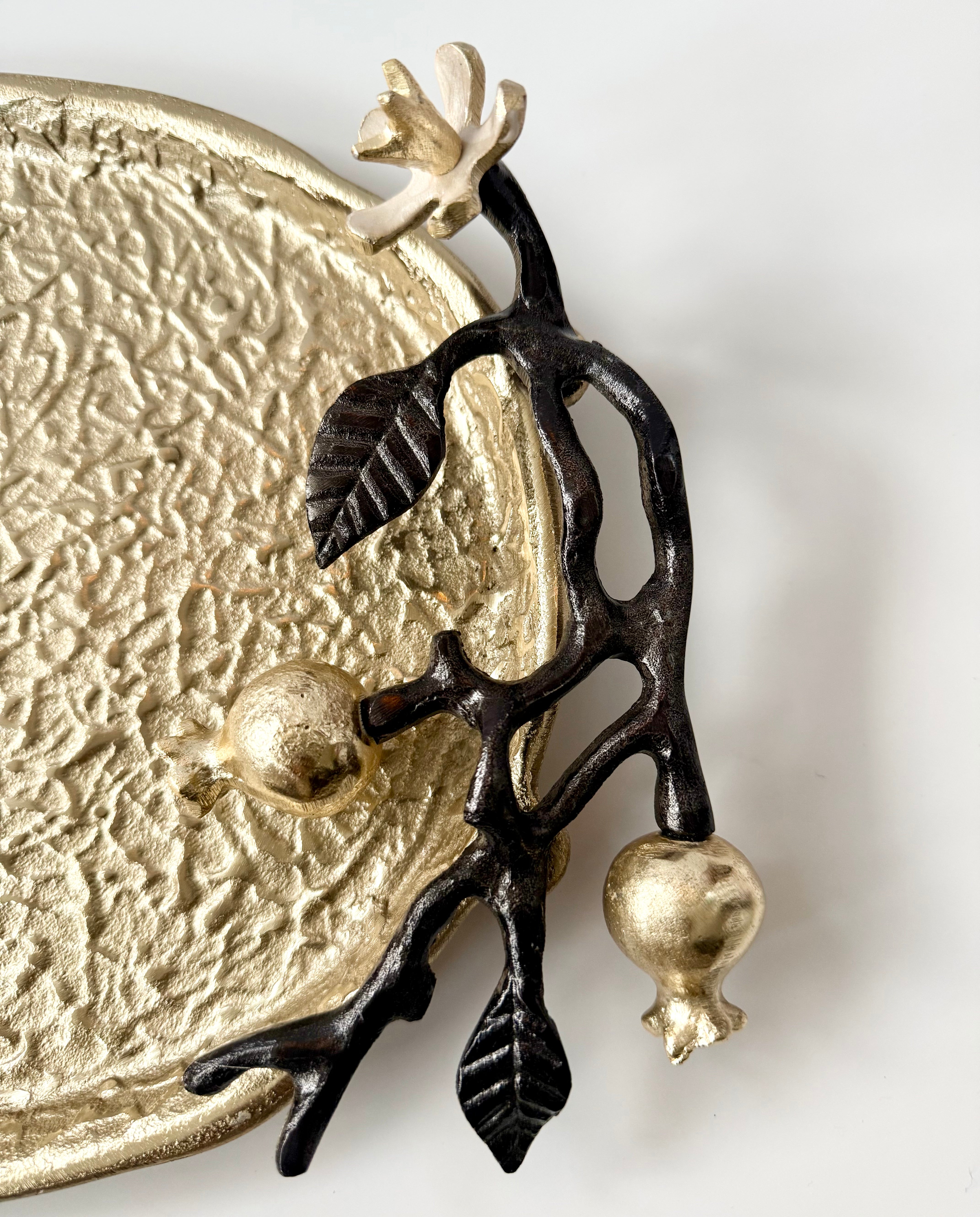 Elevate your interior with timeless elegance using this decorative tray featuring gilded pomegranate handles. Crafted from solid cast aluminum and finished in a warm, brushed gold, each tray masterfully combines ornamental beauty with functionality, becoming an instant classic for a traditional home. The sculpted handles are adorned with pomegranate branches, their leaves and fruit delicately rendered. Rich in symbolism, the pomegranate has long represented abundance, prosperity, and enduring beauty, lending these trays a dimension that is both decorative and deeply meaningful. Their refined botanical details give them the allure of antique objects, as if discovered in the drawing room of a prestigious European estate. They harmonize perfectly with French country, classic, and traditional interiors, adding a regal and romantic touch.