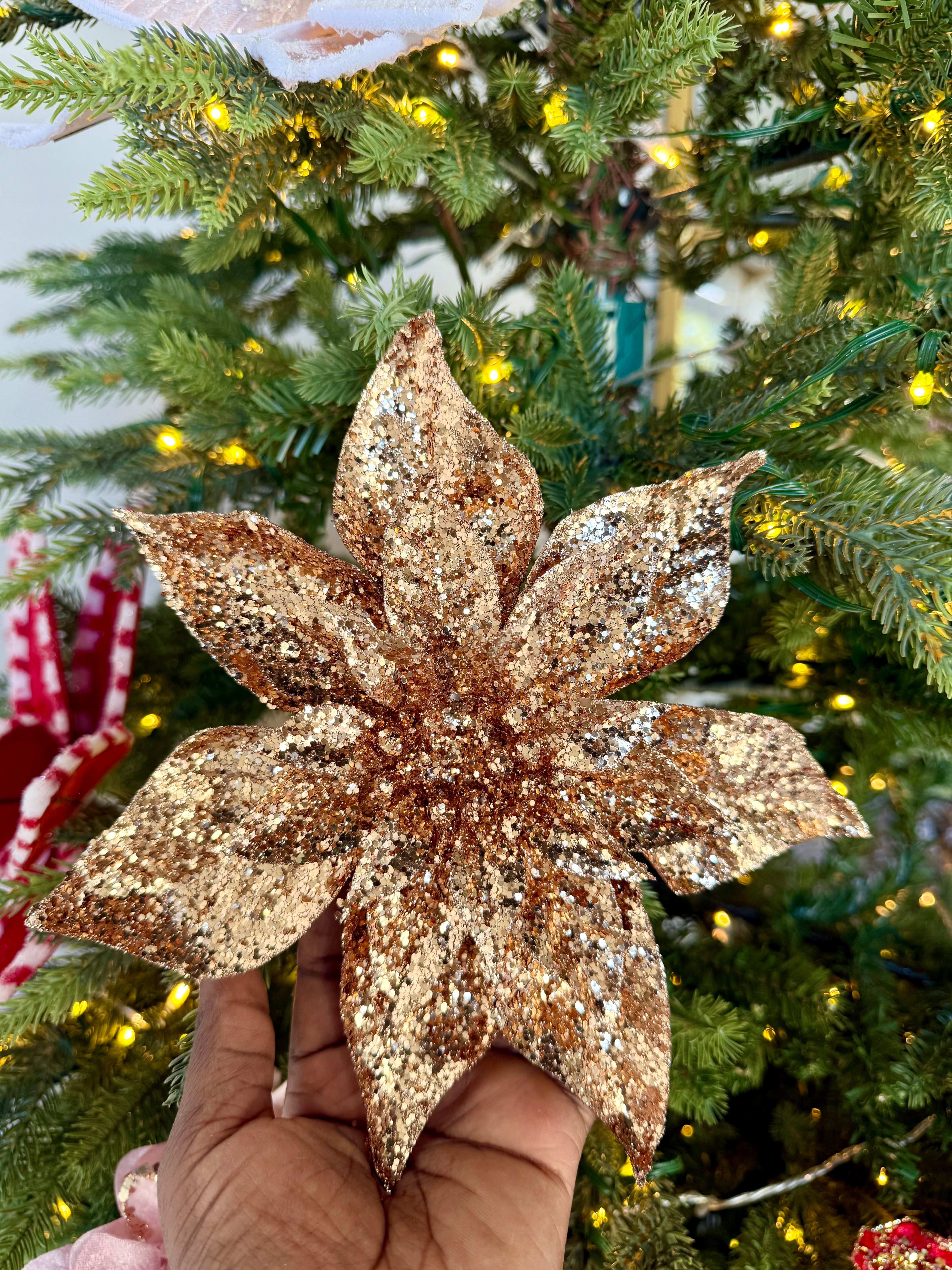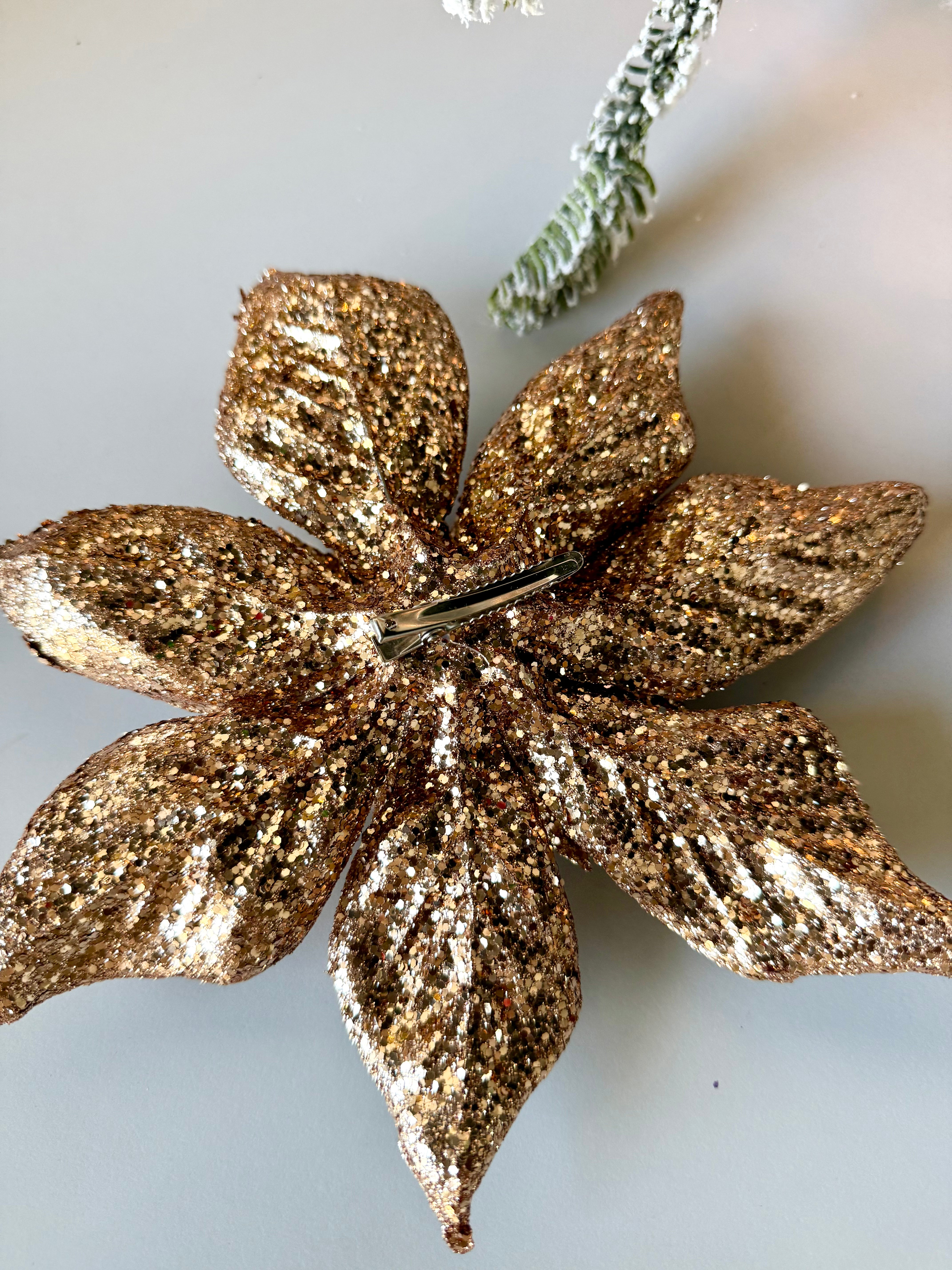 A sprinkle of gold brings magic to your holidays. Meet the Gold Glittered Poinsettia Christmas Floral Pick—a shimmering masterpiece for your holiday decor. Its clip-on design transforms any space effortlessly. Add this touch of elegance to your festive arrangements and let your holiday spirit sparkle. Make your holiday decor look sophisticated with all of our luxury collections for this Christmas season. Happy Holiday from our family to yours🎄