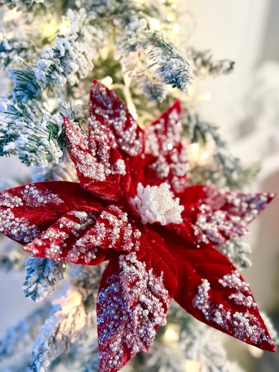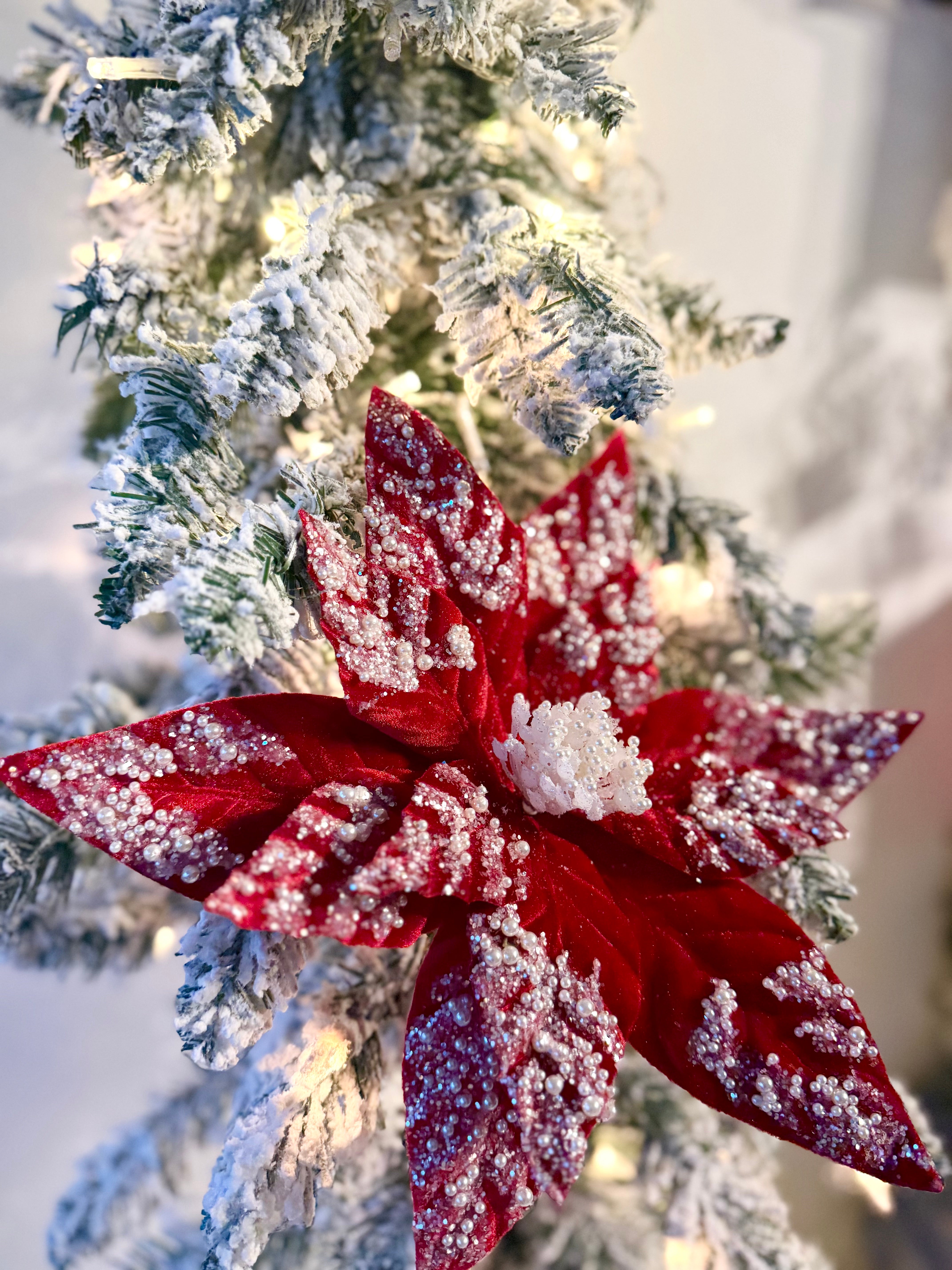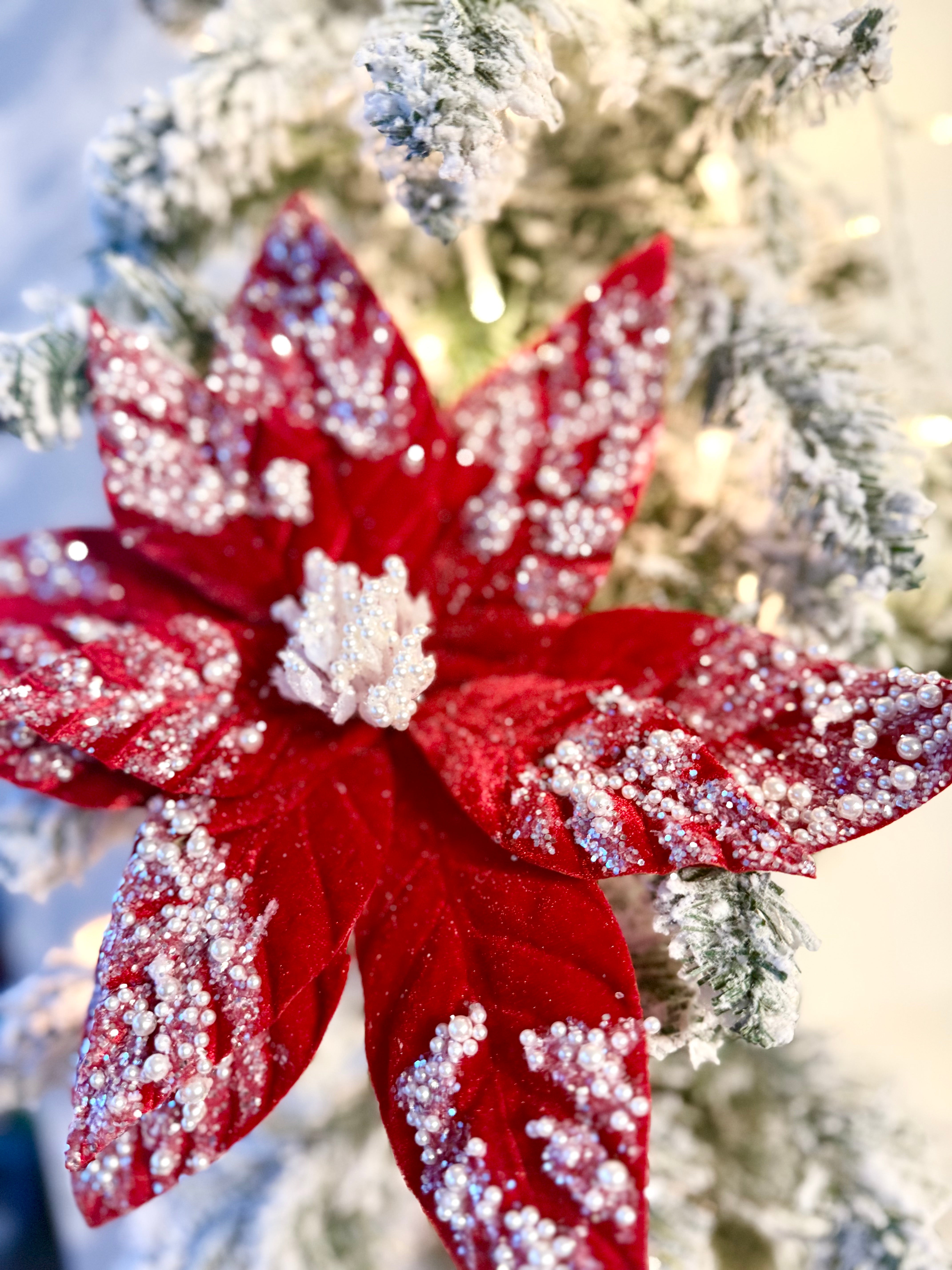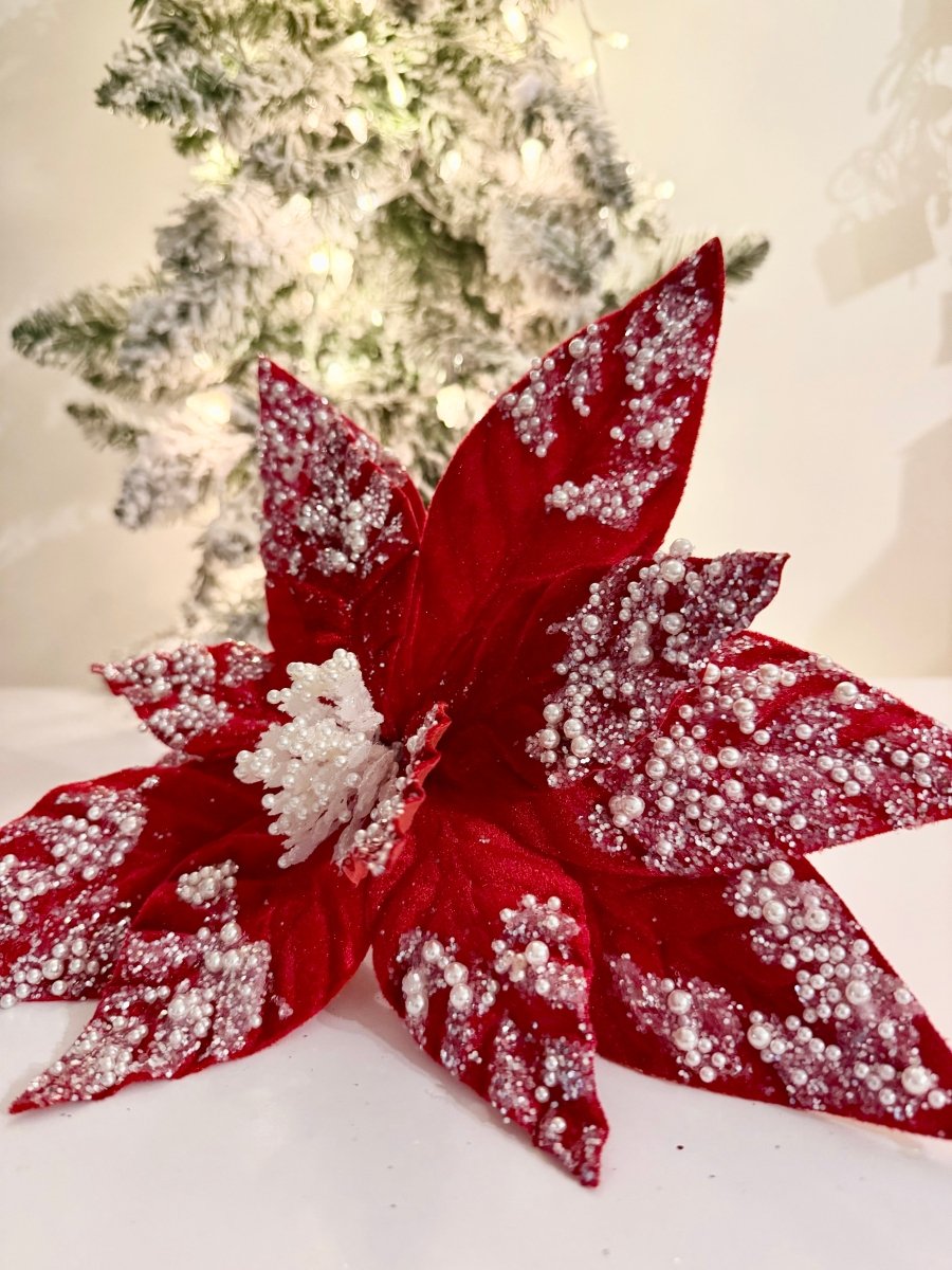 Elevate your Christmas décor with our tall poinsettia stem adorned with white pearls. Standing 22”tall, this magnificent stem showcases a lush red poinsettia, enhanced with delicate white pearls for a captivating and striking effect. Create an exceptional centerpiece that captures the spirit of the holidays; this stem complements any space. Perfect for adding a touch of sophistication and Christmas magic to your tree, wreaths, or floral arrangements, this stem is a holiday essential. The combination of the poinsettia's vibrant red and the delicate pearls guarantees a truly festive and unique result. These stems promise to make your Christmas décor unforgettable.
