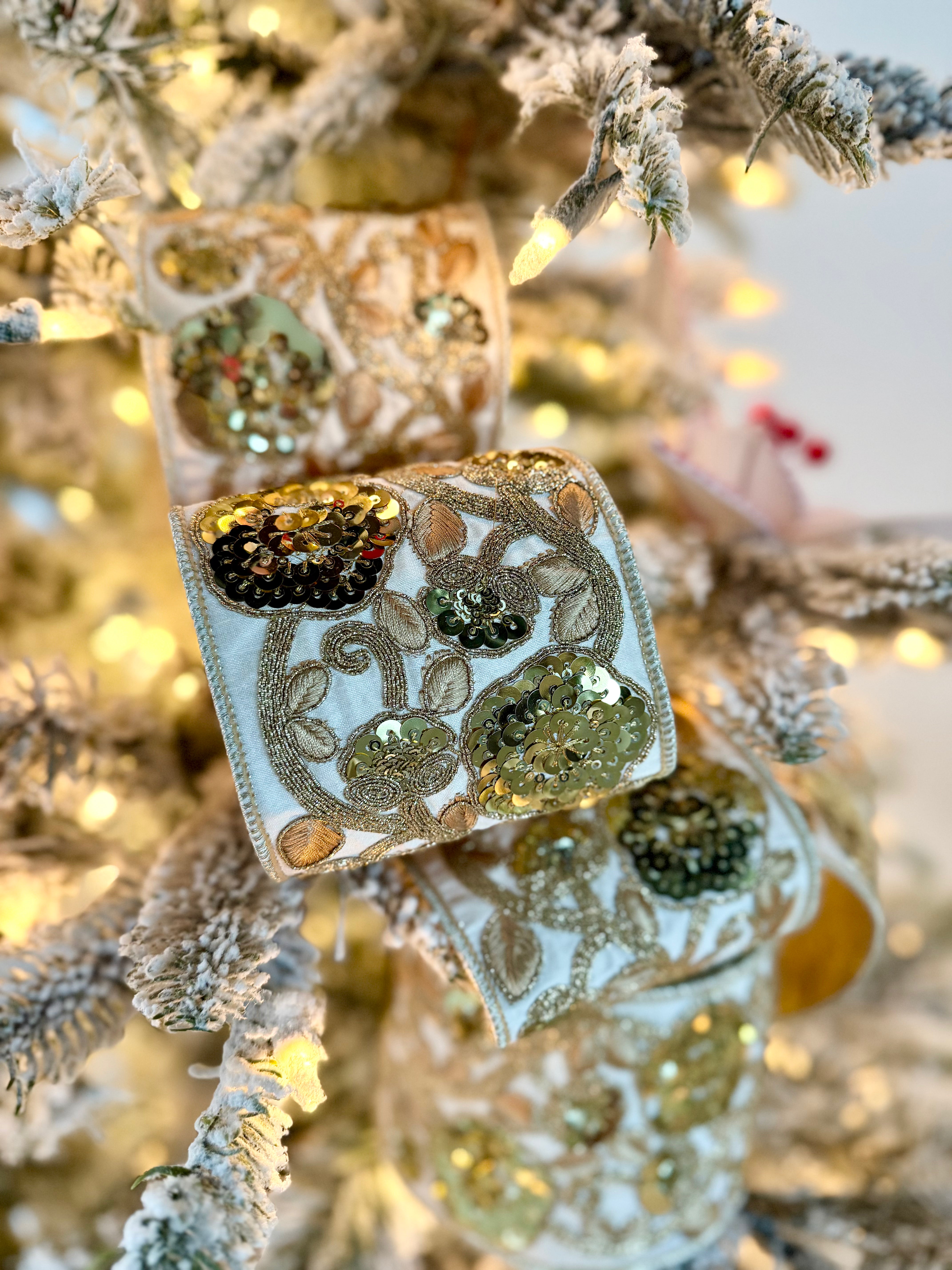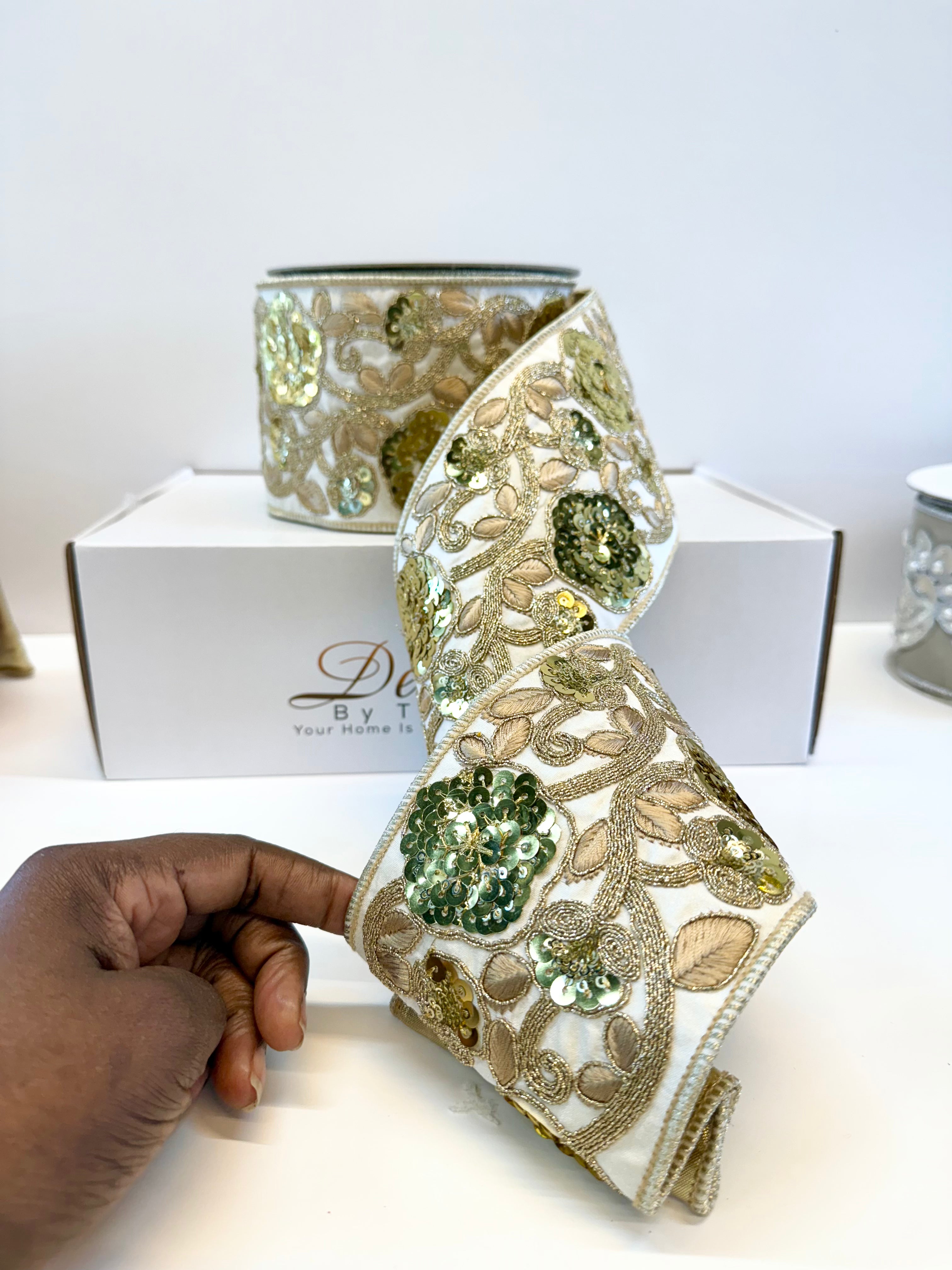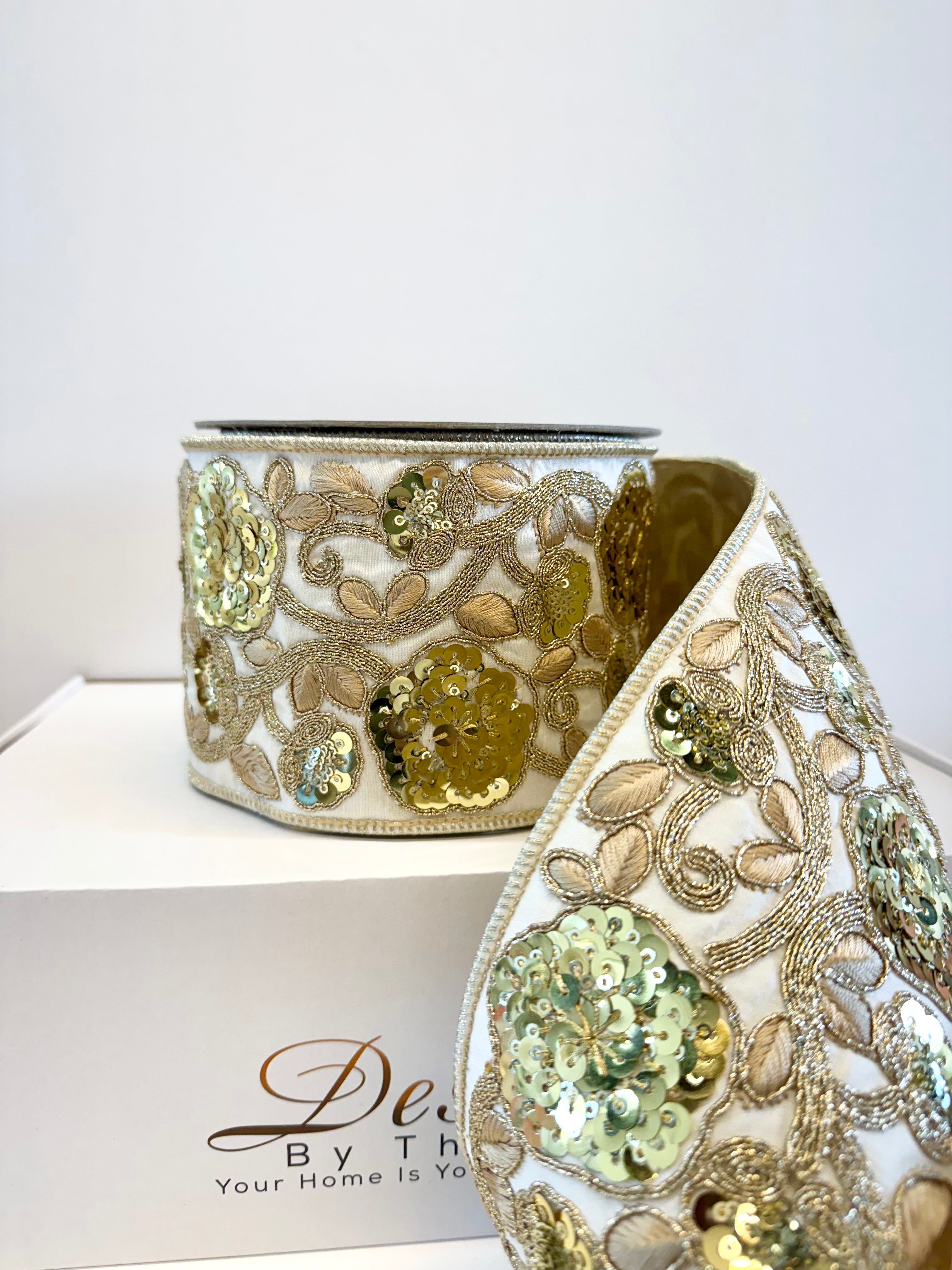 Enhance your Christmas decorations with the luxurious touch of our Ivory Sequin Embroidery Ribbon, adorned with sequin. This exquisite combination not only captures attention, but also offers a striking contrast and a generous width that enhances every detail. Bring a touch of sophistication to your decorations with a refined sequin that complements the rich gold hue. At a generous 10 yard, it is perfect for creating exceptional displays.