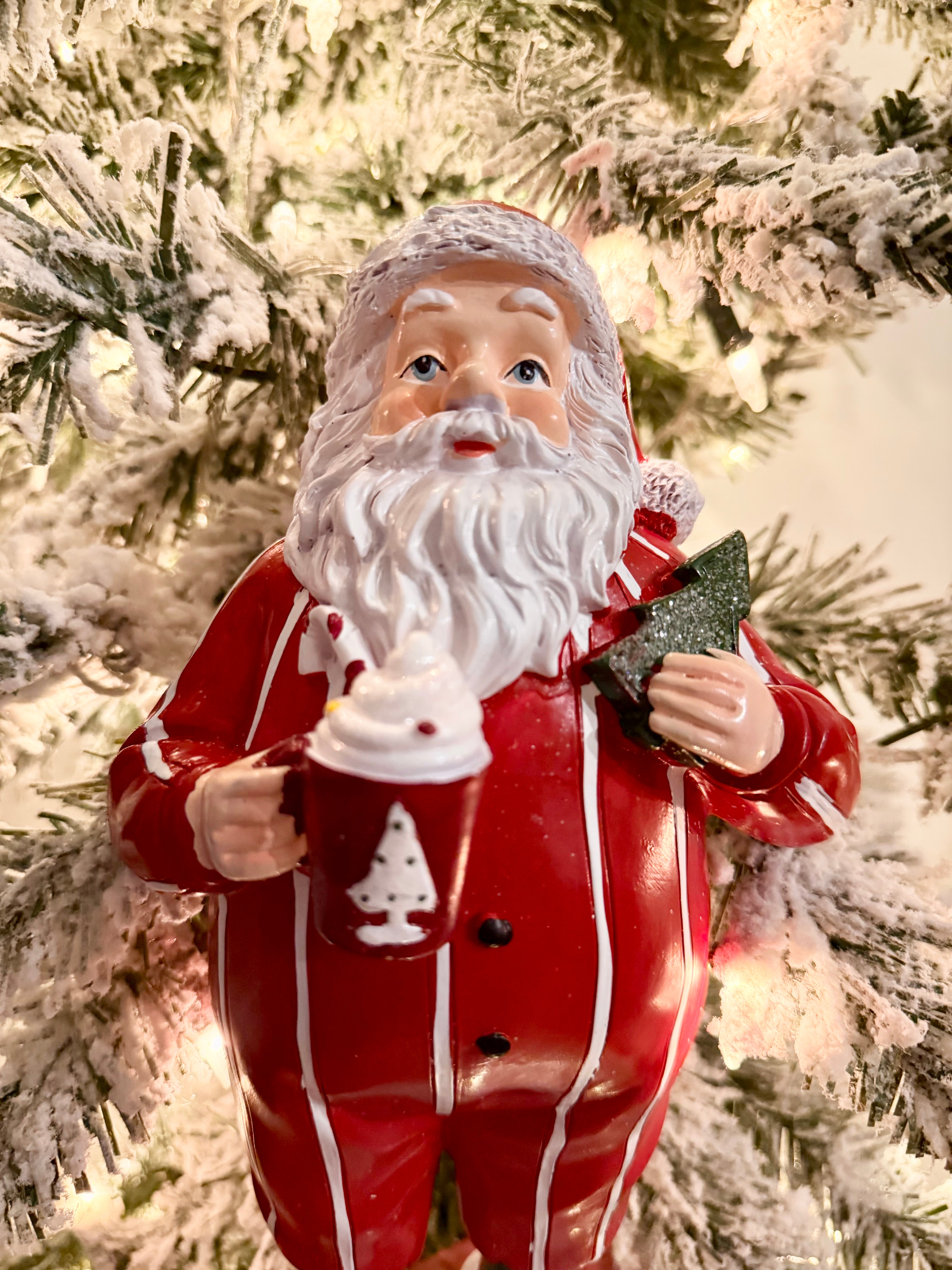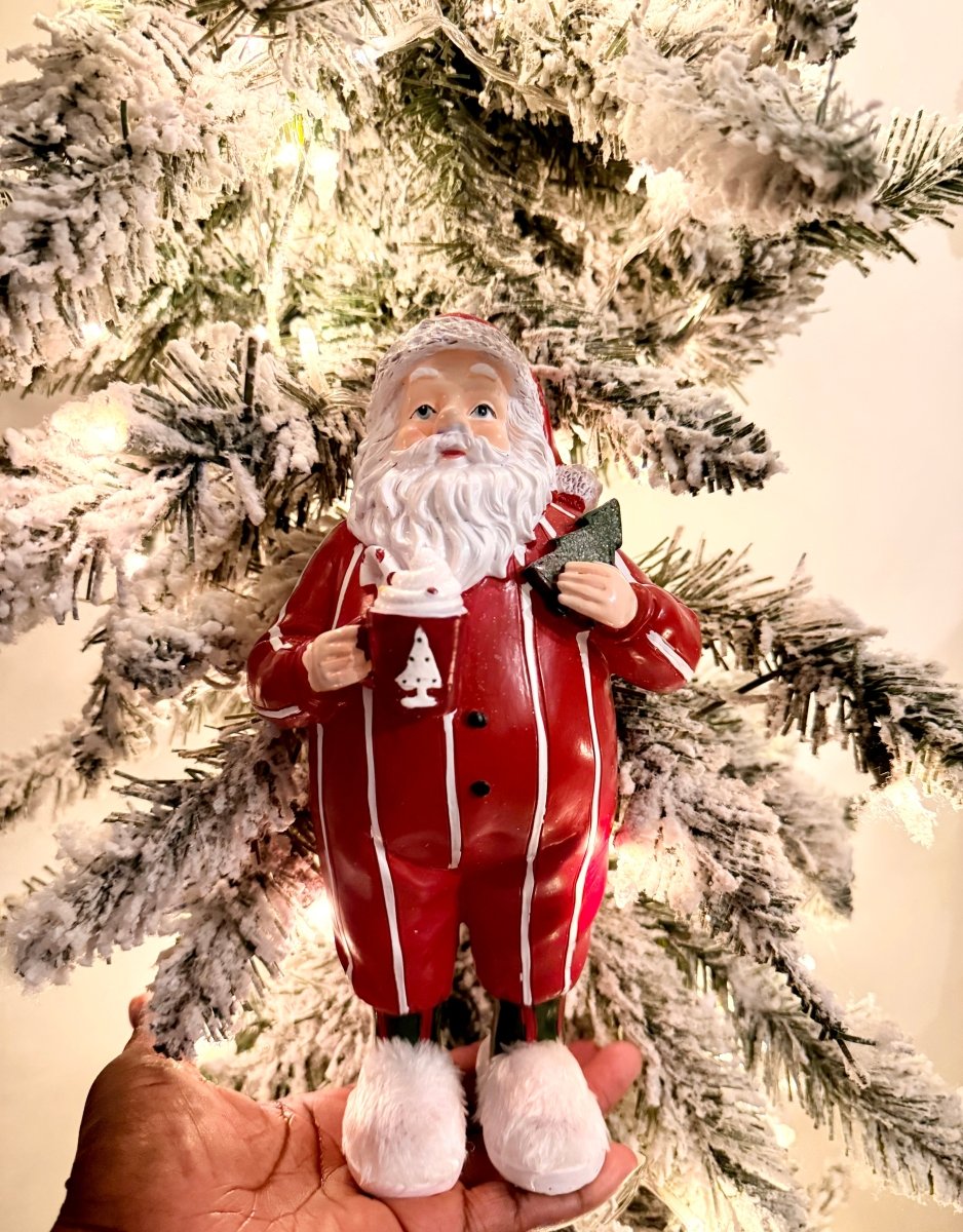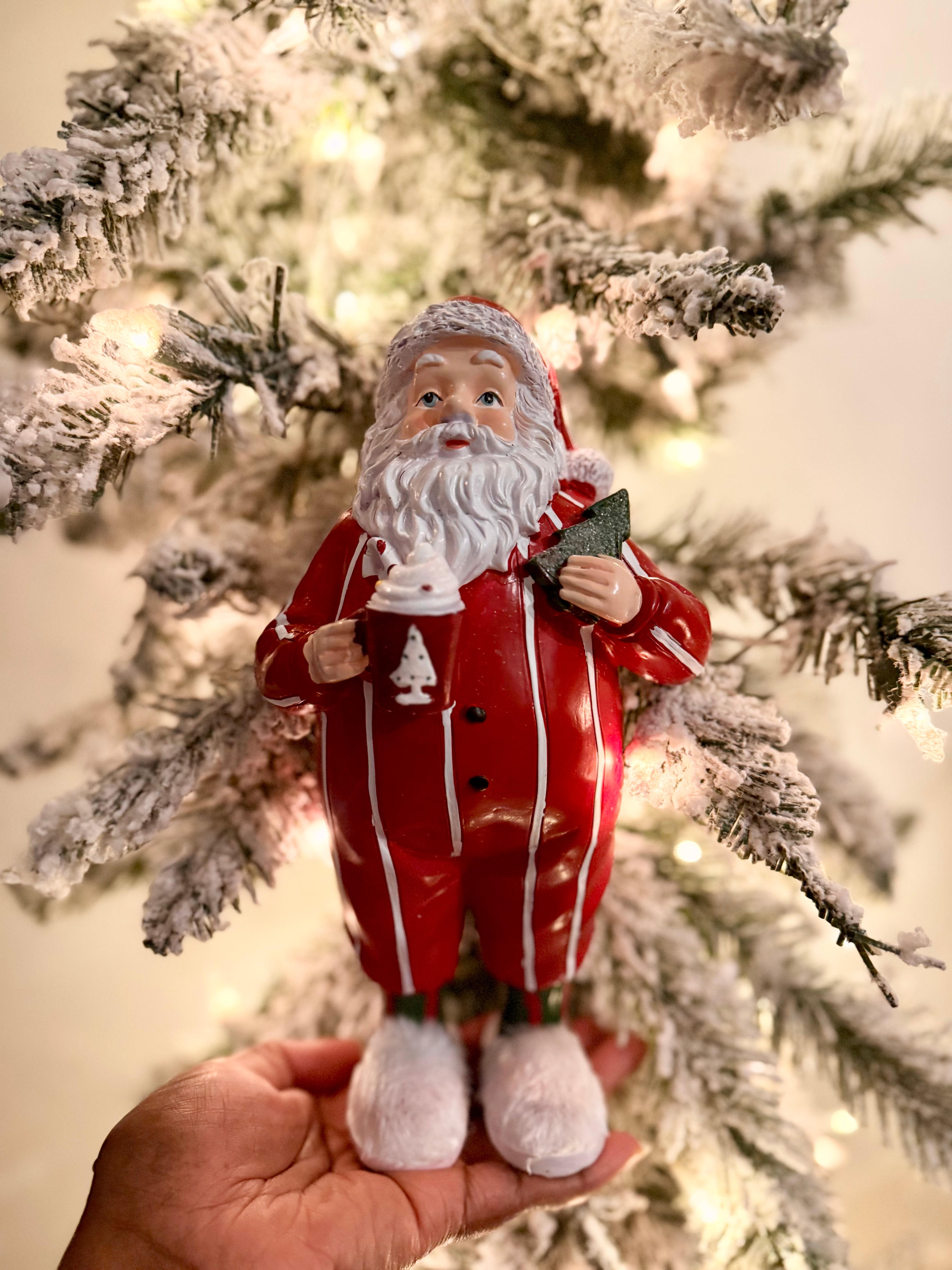 Santa clause in Pajamas holding cappuccino cup. Santa's getting ready for his big night, and the magic begins with a delightful midnight snack! 🎅✨ Freshly baked cookies, a glass of Hot Cocoa, and a sprinkle of joy set the scene. Picture this: a cozy fireplace, twinkling lights, and Santa indulging in festive treats. What cozy treats do you leave out for Santa?