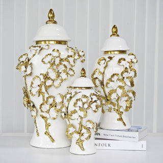 A touch of elegance blooms with our White and Gold Ginger Jar adorned with exquisite floral designs. This elegant white and gold ginger jar, adorned with intricate floral designs, captivates with its timeless charm. Perfect for adding a touch of sophistication to any room, it complements both modern and classic decor. Choose from two exquisite sizes—perfect for any setting. With a removable lid, these temple jars are not only exquisite but also versatile. Place them on a mantel, a side table, or use them as the centerpiece of your dining table to create an aura of luxury and style. Their adaptability ensures they effortlessly complement your decor, whether it's traditional, contemporary, or eclectic. Maintaining the pristine beauty of these temple jars is a breeze - simply wipe them with a damp cloth or a non-abrasive cleaner. This low-maintenance approach allows you to enjoy their regal charm without any hassle. Admire its beauty on your mantle or as a centerpiece.