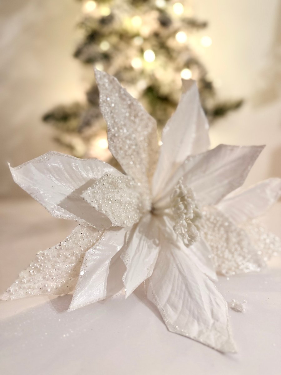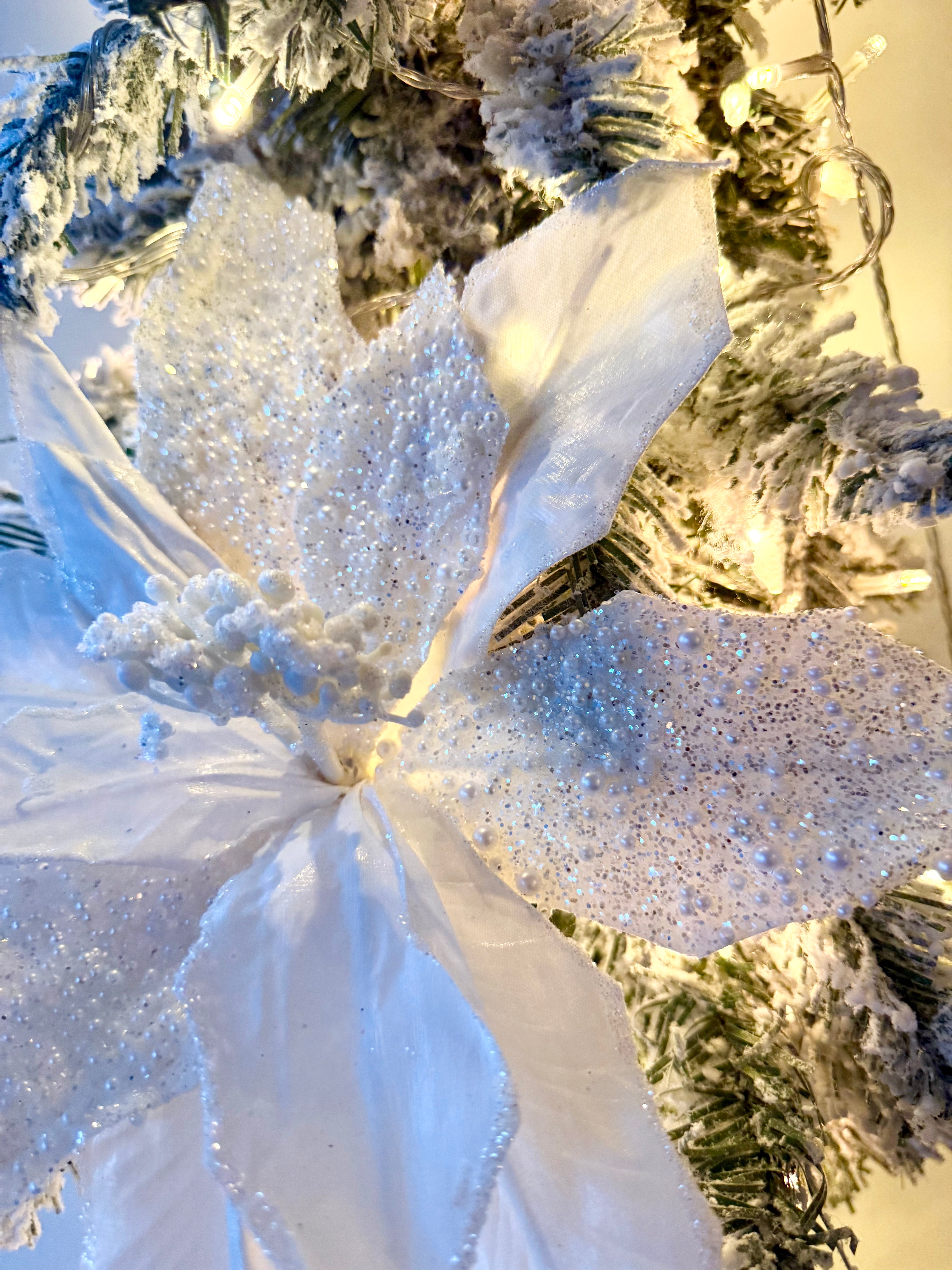 Seeking a touch of opulence for your Christmas tree? Introduce the Jeweled White  Poinsettia Pick—crafted with sumptuous velvet and adorned with white pearl, it captures the essence of holiday luxury. Add this stunning piece to your decor and let your tree shine in festive splendor. The Jeweled Pearl White  Poinsettia Pick enhances your Christmas tree with its exquisite charm. Make your holiday decor look sophisticated with all of our luxury collections for this Christmas season. Happy Holiday from our family to yours🎄
