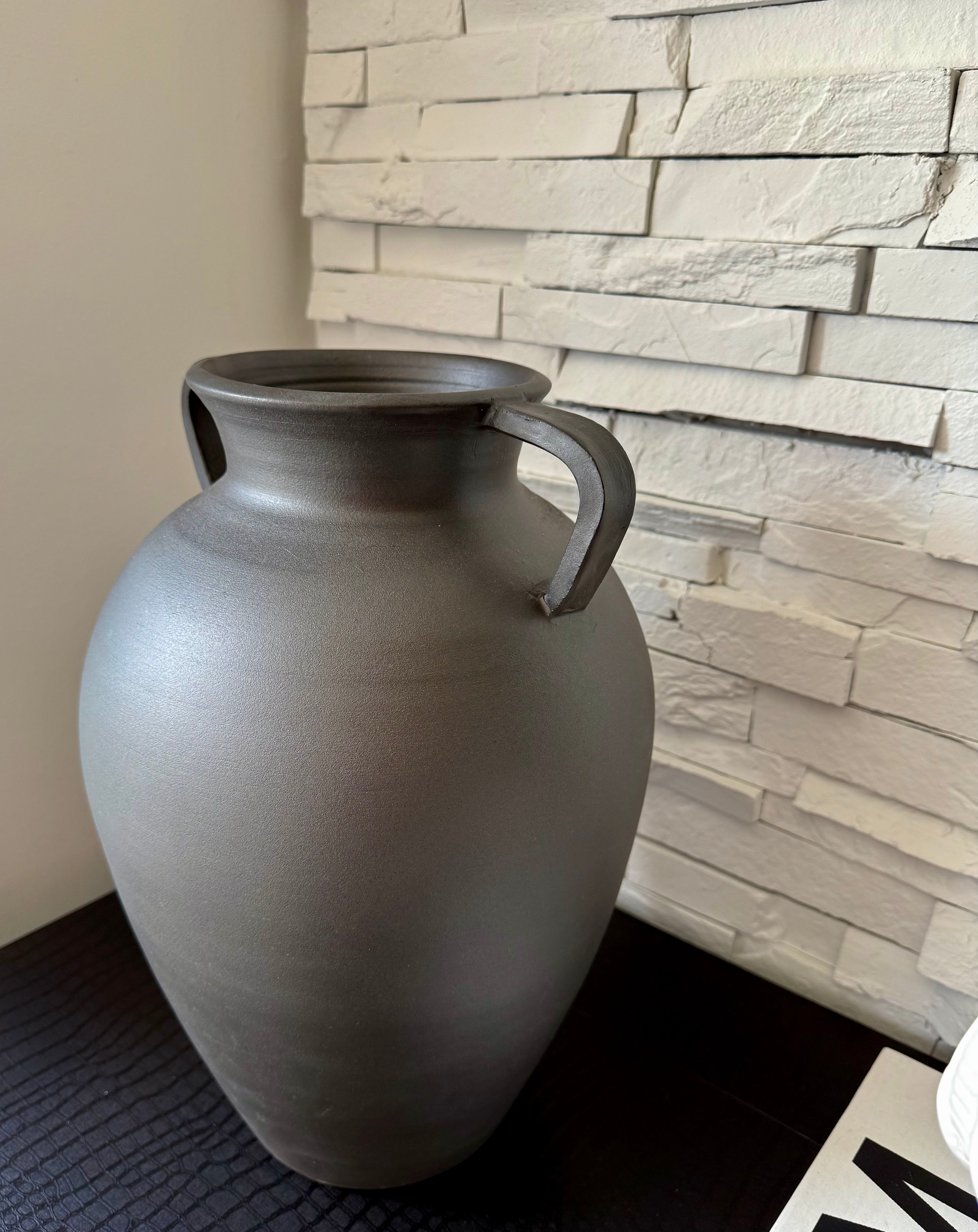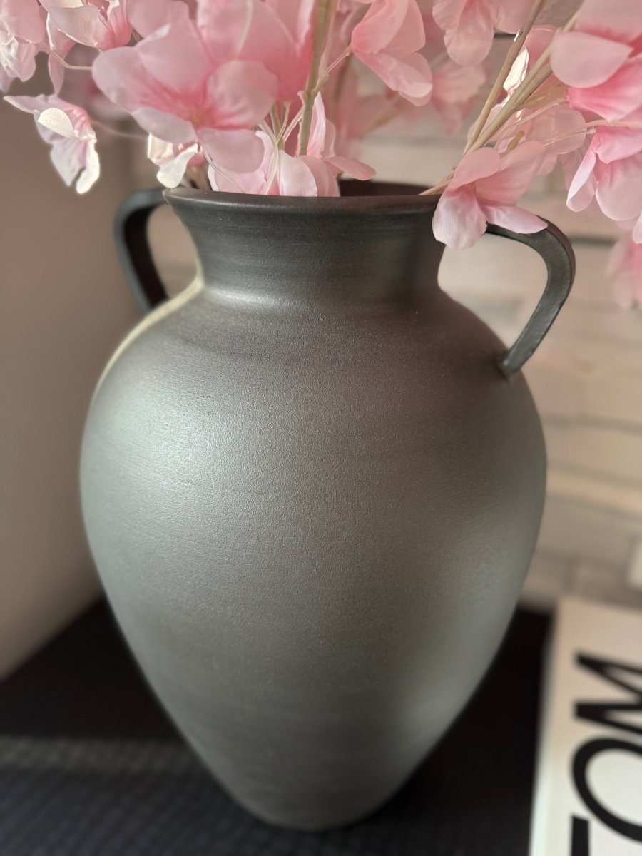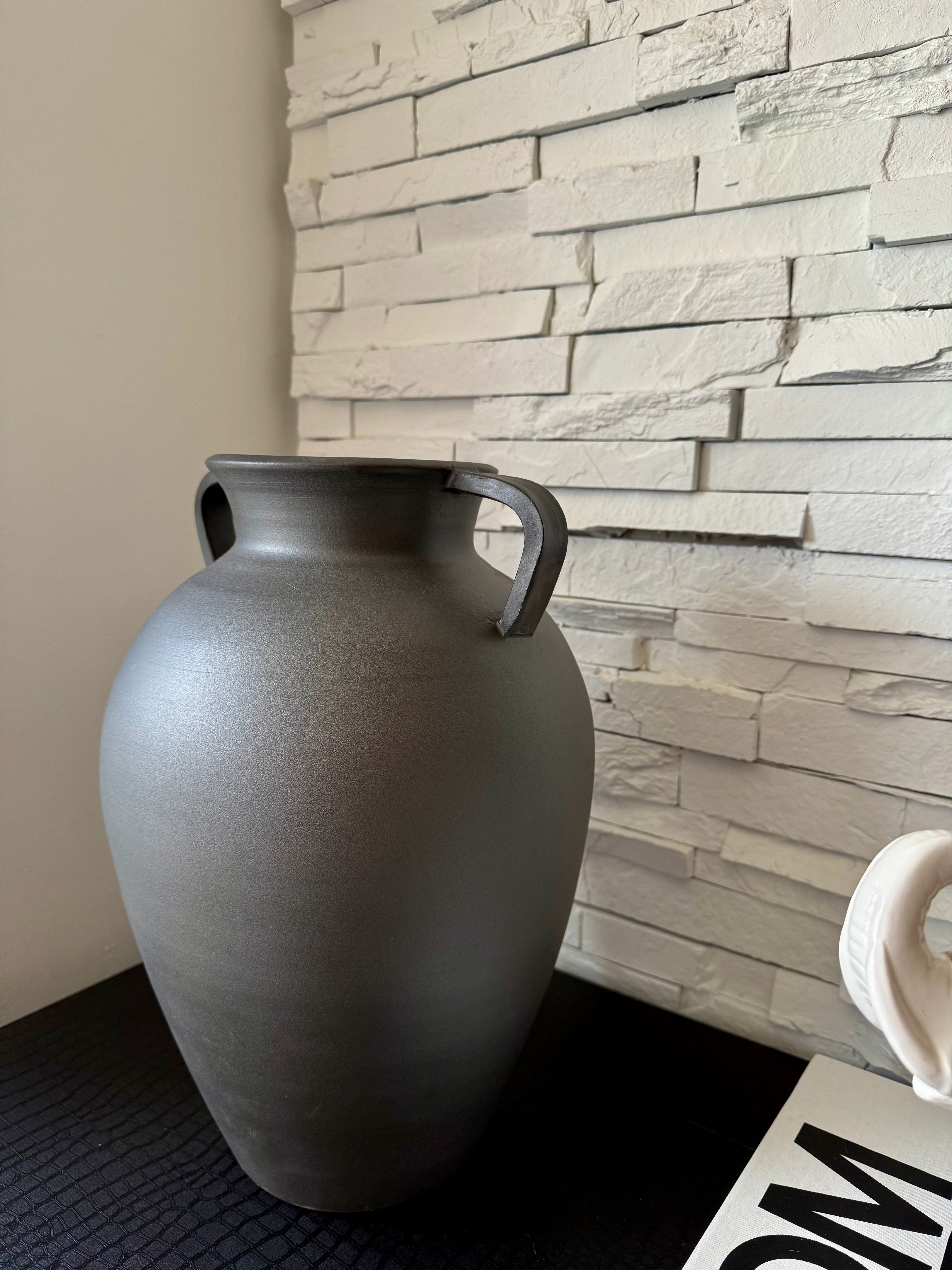 This large black artisan handcrafted terracotta vase takes center stage. Perfect for the living room or entryway, it stands as a testament to exquisite craftsmanship. Pair it with our best-selling greenery branches for an elegant floral arrangement that completes your space with style. Its bold elegance complements any living room entryway.
