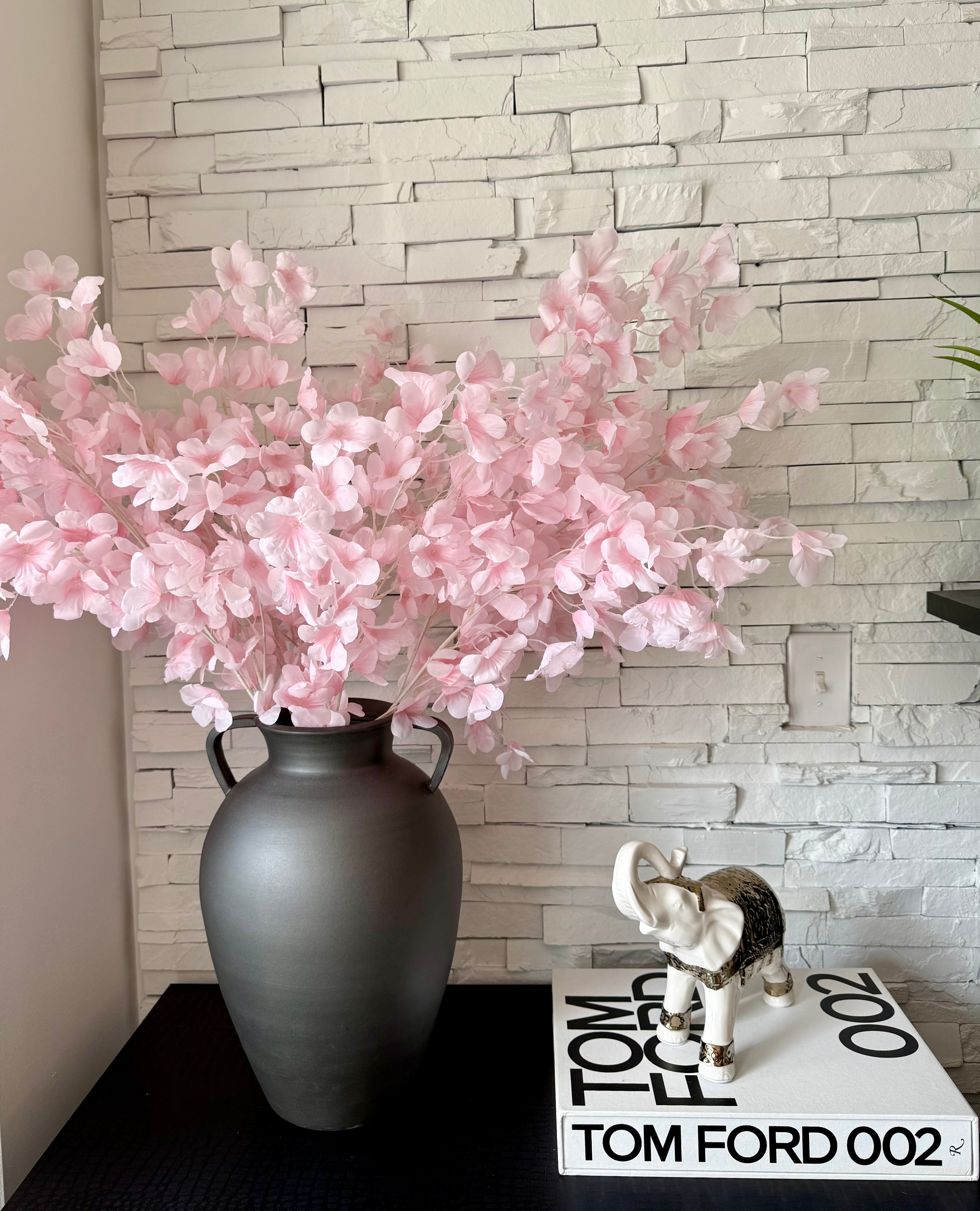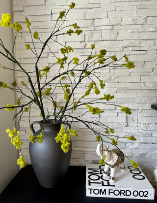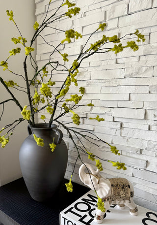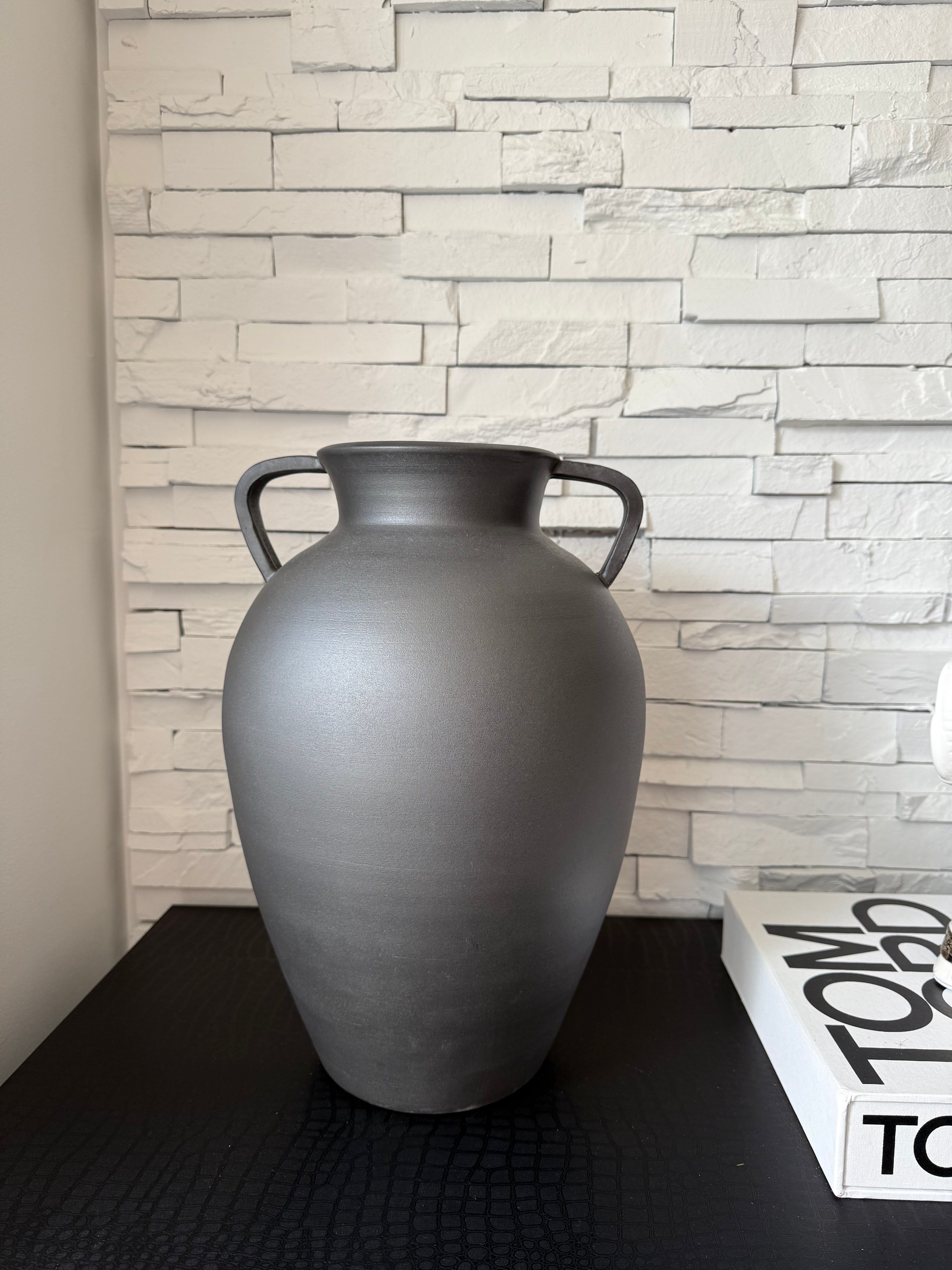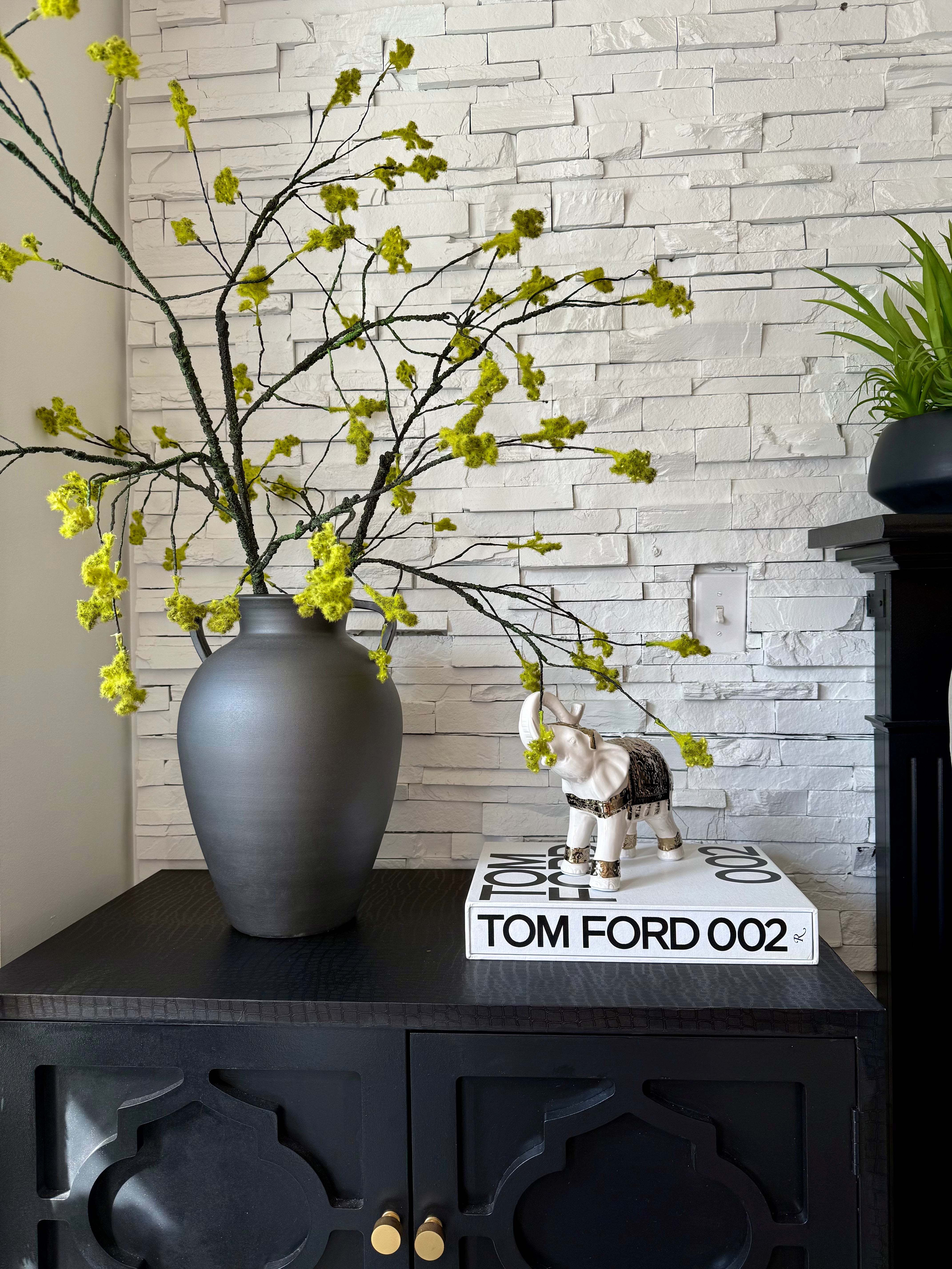 This large black artisan handcrafted terracotta vase takes center stage. Perfect for the living room or entryway, it stands as a testament to exquisite craftsmanship. Pair it with our best-selling greenery branches for an elegant floral arrangement that completes your space with style. Its bold elegance complements any living room entryway.