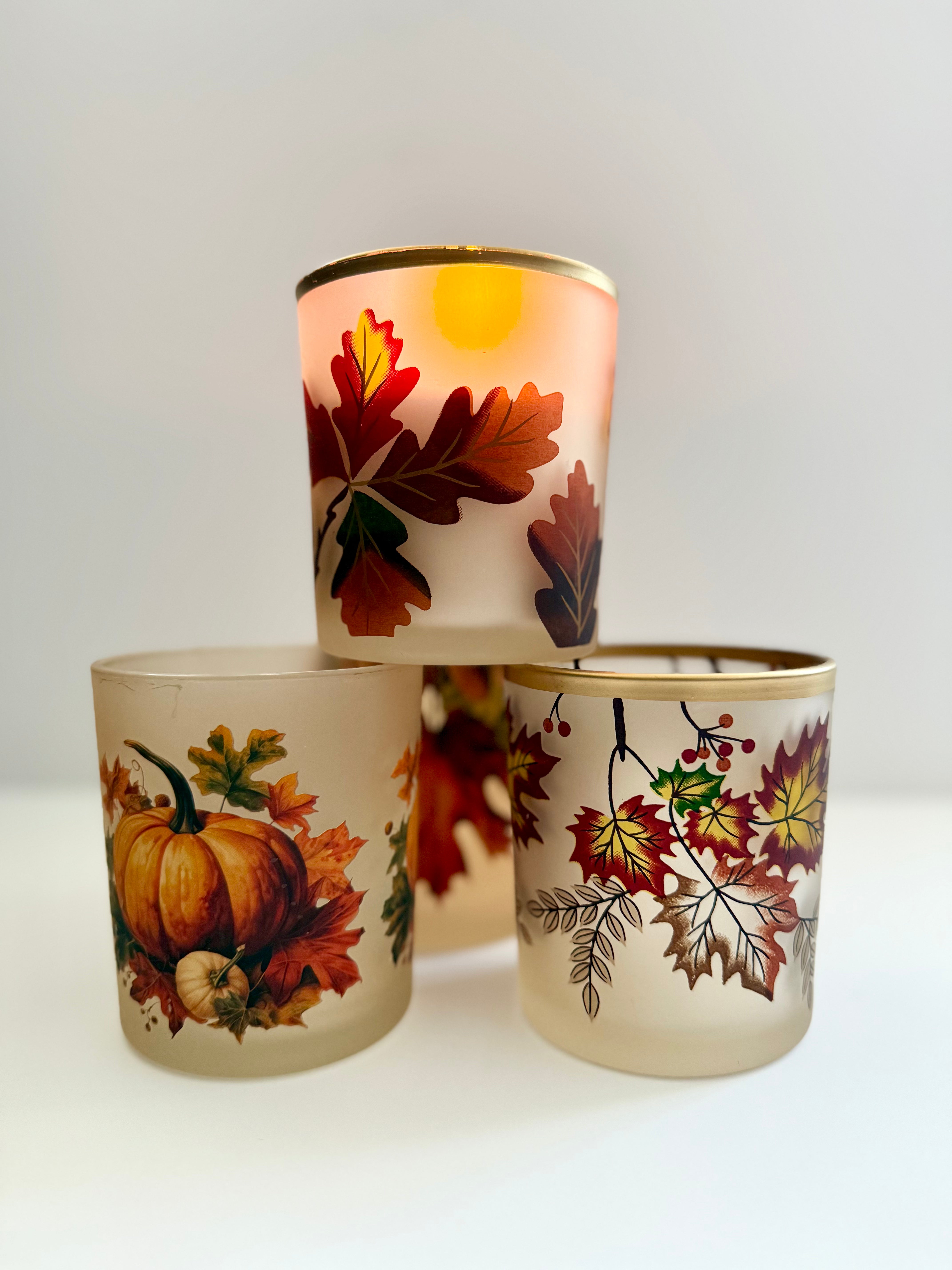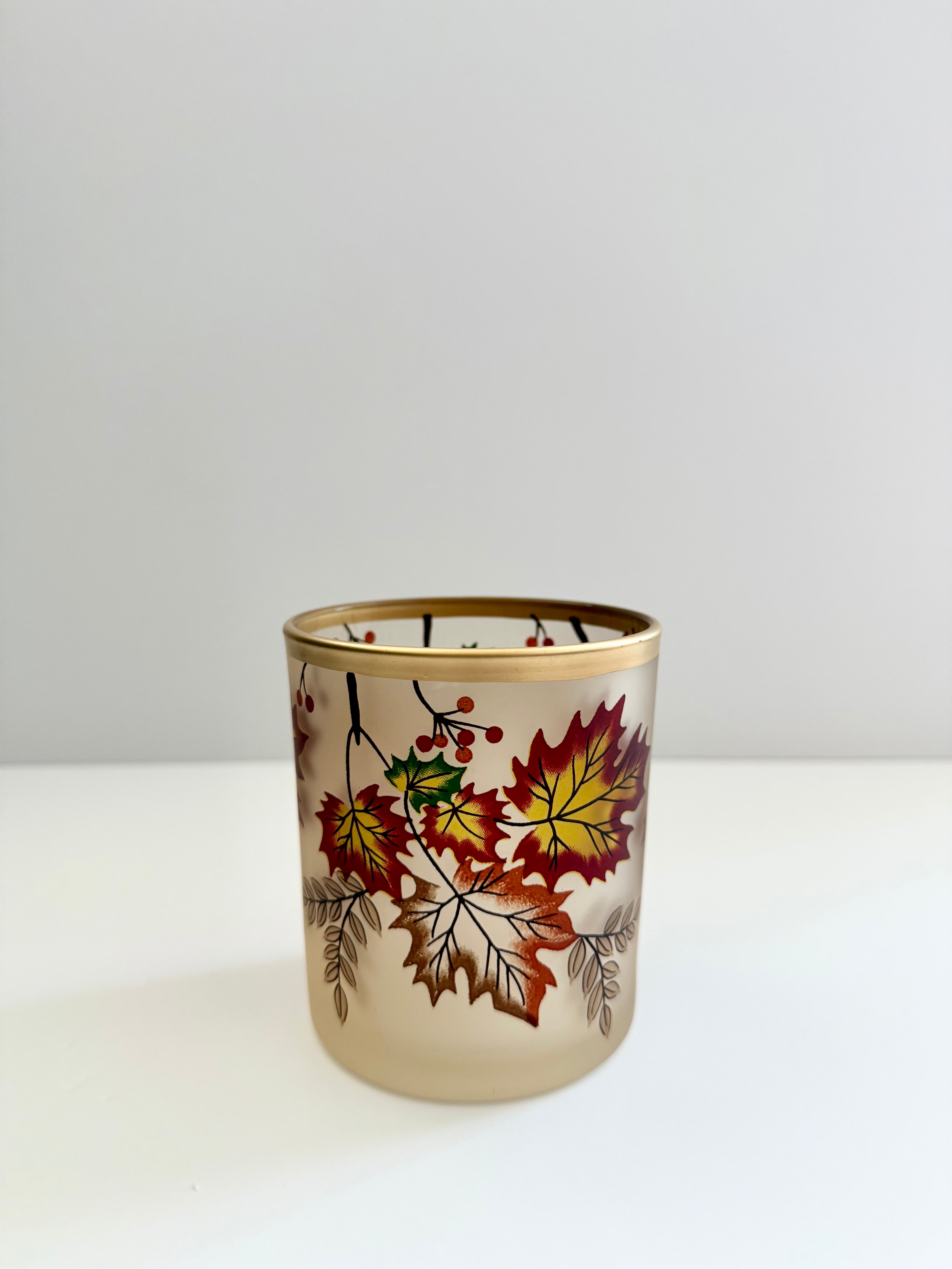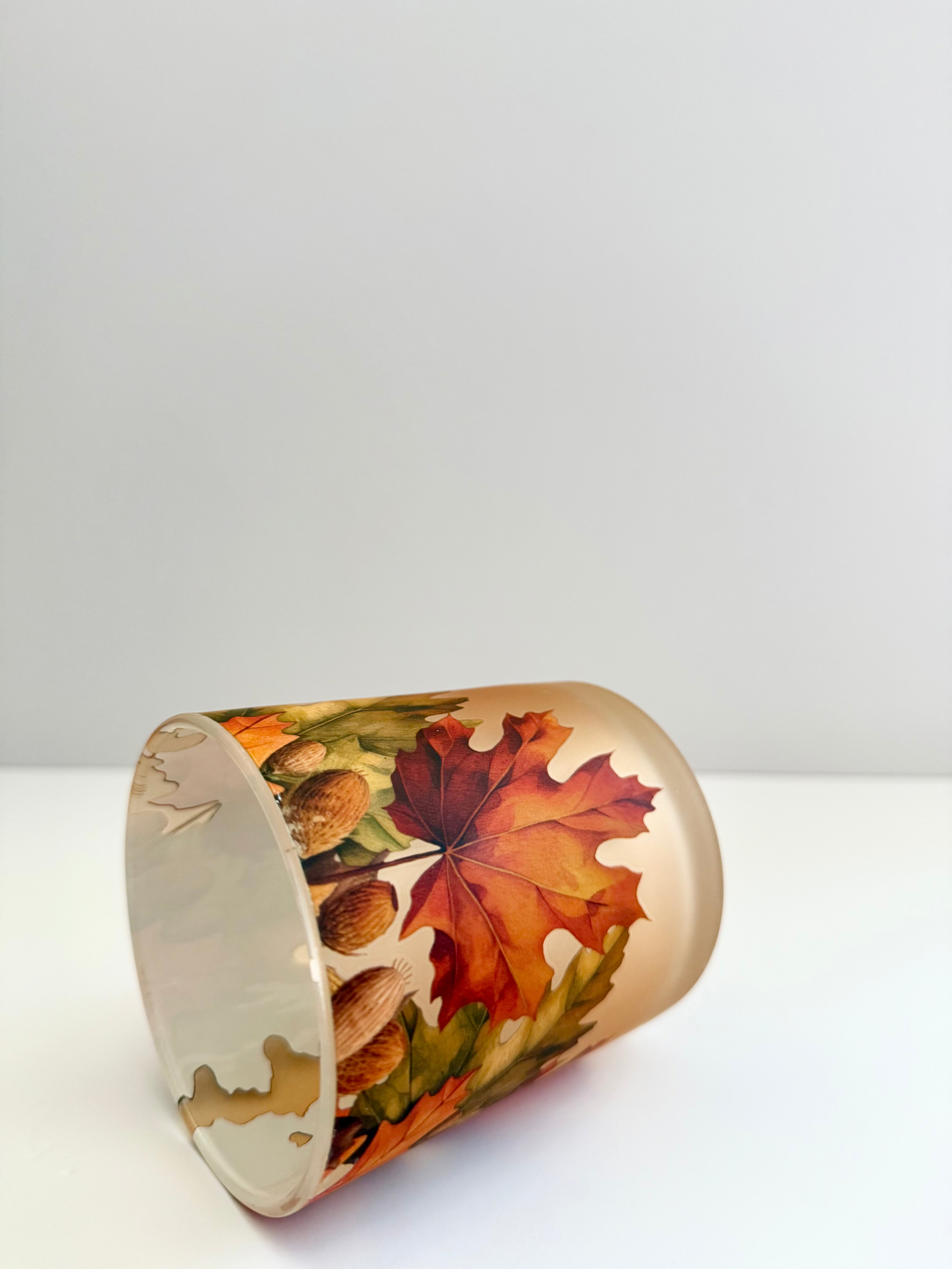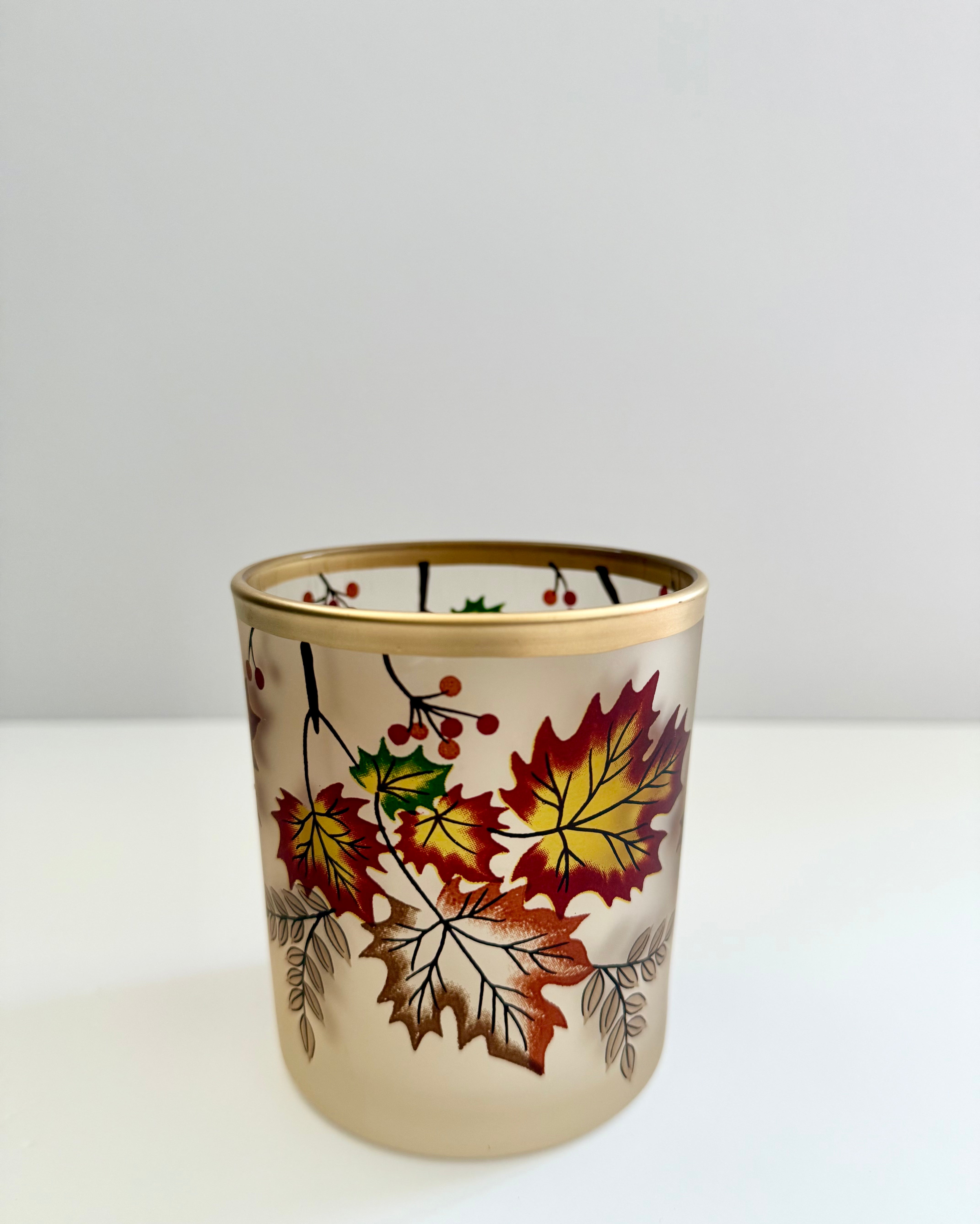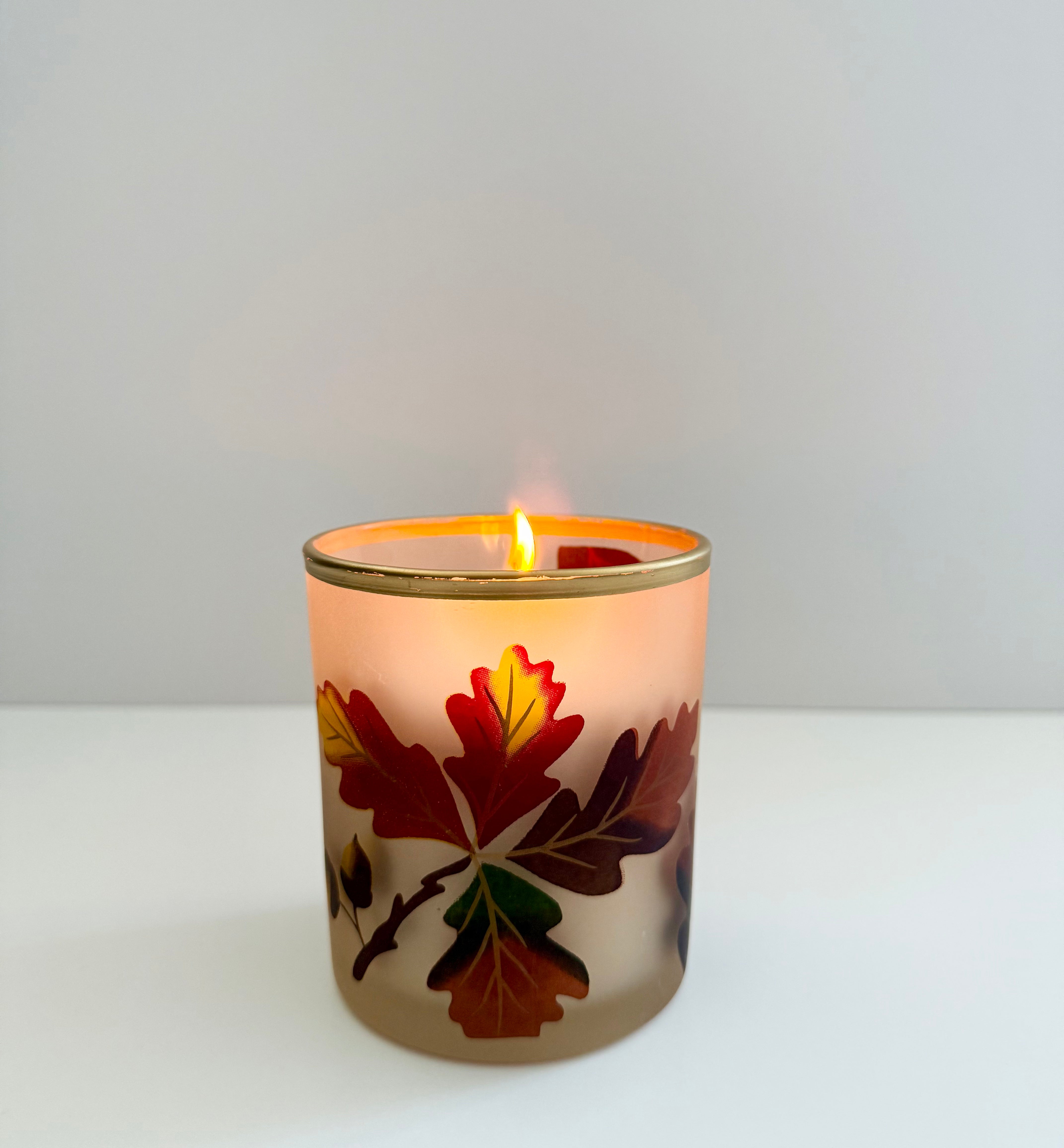 Autumn is a warm and cozy season that offers the opportunity to layer textures, soften the light, and surround yourself with colors and materials that inspire calm and serenity. Bring the beauty of autumn into your home with this glass candle holder. Featuring a matte finish, it creates a warm and inviting glow when paired with a candle. The leaves in varying shades of all colors add a seasonal touch, making it a perfect addition to your mantelpiece or centerpiece. Ideal for creating a cozy atmosphere, this candle holder will enhance any decor with its elegant style.