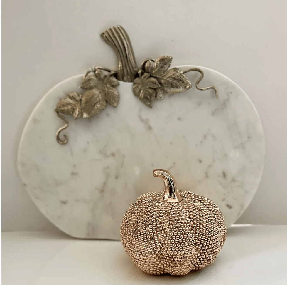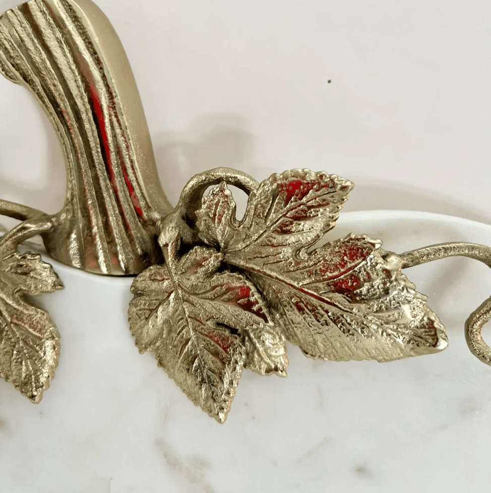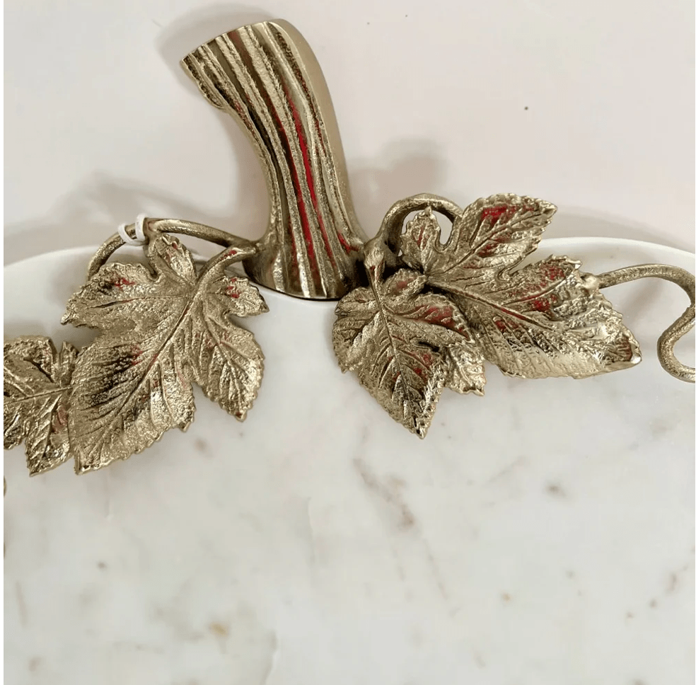 Entertain your guests with this natural marble serving tray featuring gold metal leaf accents, pumpkin. It is a multipurpose server can be used to decorate the kitchen or in a party to serve your desserts. *Marble is a product of nature and no two pieces are exactly alike, it is prone to variations in color and/or patterns in the material that adds to the beauty and charm of the piece.