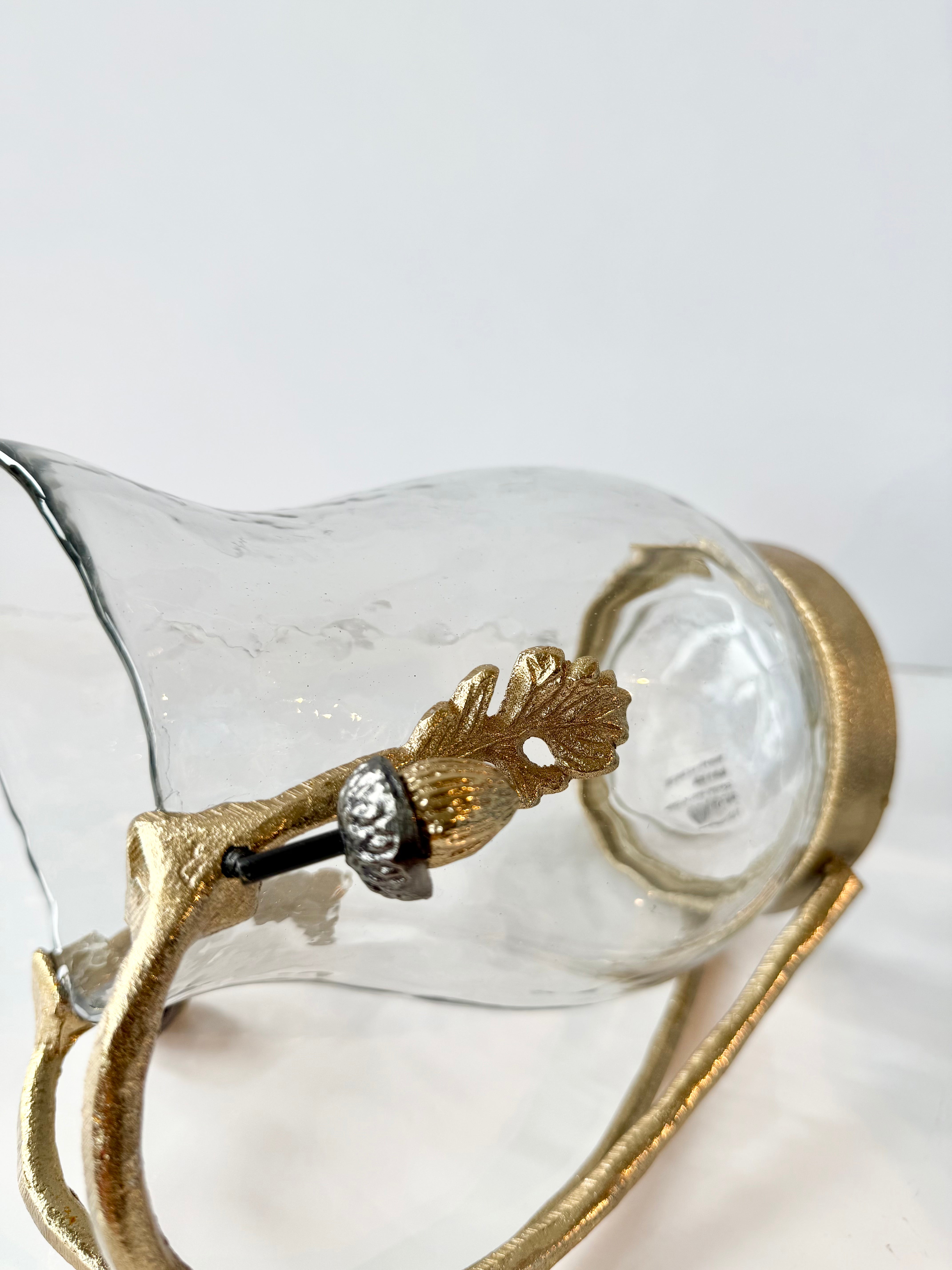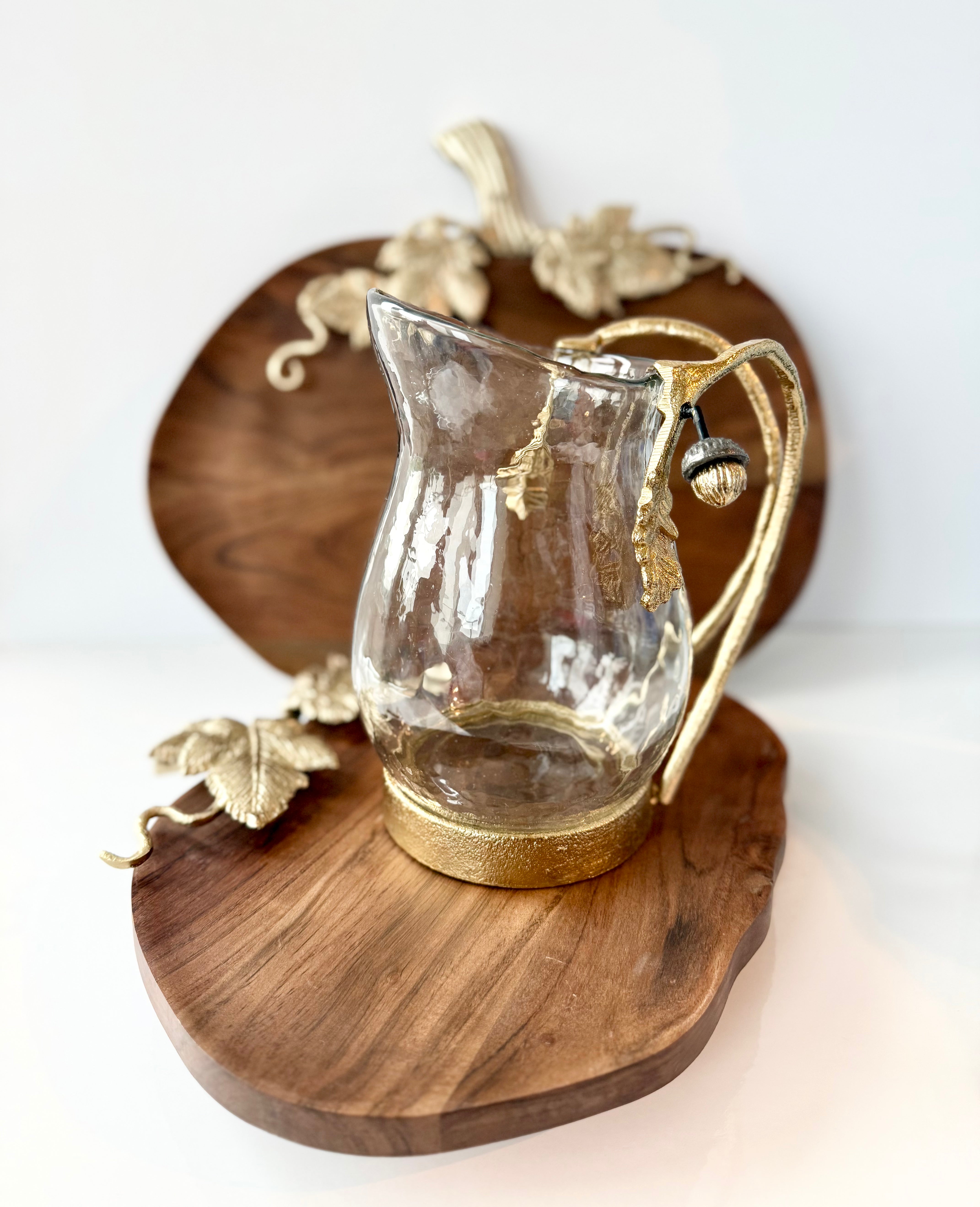 This beautiful glass pitcher will enhance your table setting. The modern simplicity of this metal makes it the perfect accessory for a refined table setting. Crafted from quality materials and meticulously sculpted by professional artisans, it will complement your collection and be perfect for any occasion. This glass pitcher features acorn and oak leaf motifs in metal.